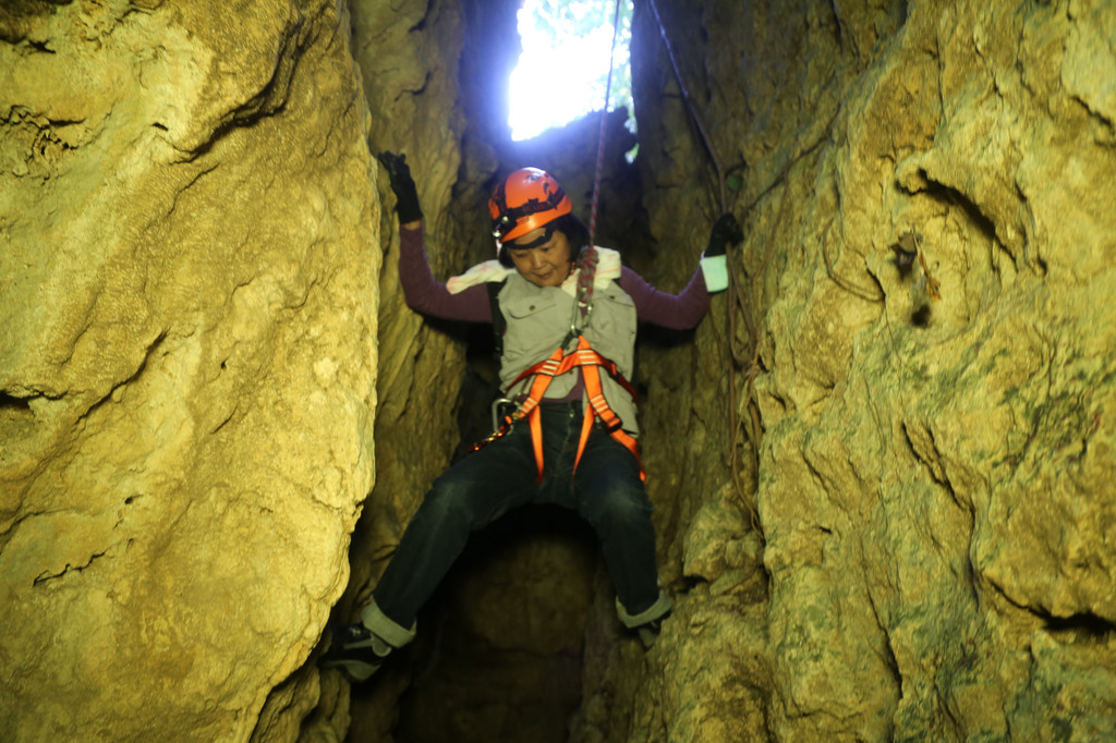 拍完一線天大合照,我們順著另一天小路迂迴地往上前進,這個路段一點都大意不得,旁邊時不時就有深不見底的地洞,要是不小心掉下去,就會變成原始地底人。教練說,今天帶我們爬的鐘乳石洞算是初階的,他還知道幾個比這大十倍以上的地洞,進去到出來,教練自己就要花上三個多小時,讓我覺得,這地方在幾百萬年前還是在海底裡,浮出水面後竟然會成為這麼有趣的山,大自然真的是永遠不會讓人覺得無聊。