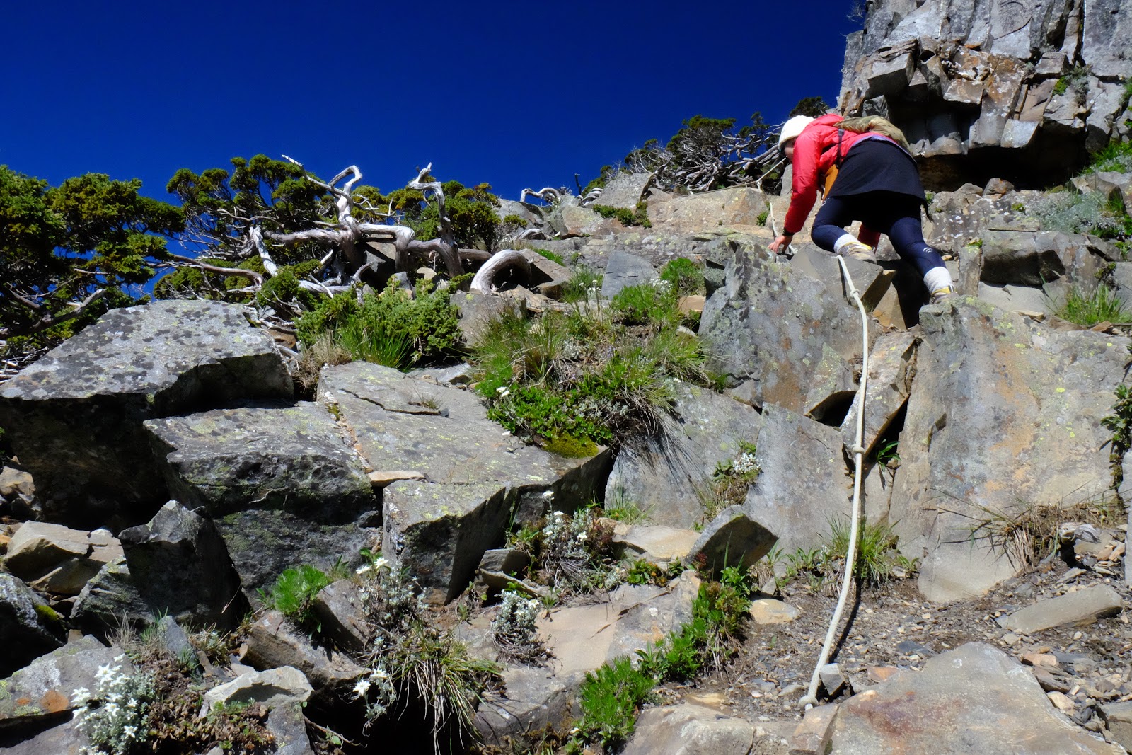 準備登頂處有比較大的落差,此處有拉繩可以輔助行走,但基本上不要只依靠拉繩喔!尤其女生會擔心自己腿沒有力氣爬不上去,會用力地拉繩子,但是繩子其實是會晃動的,如果不小心勾到前後的人或是角度不對,就有可能會失去重心。