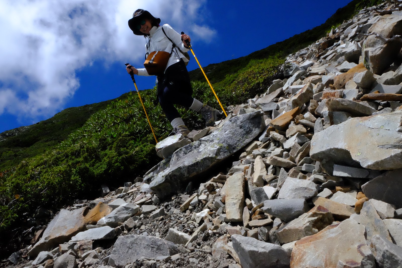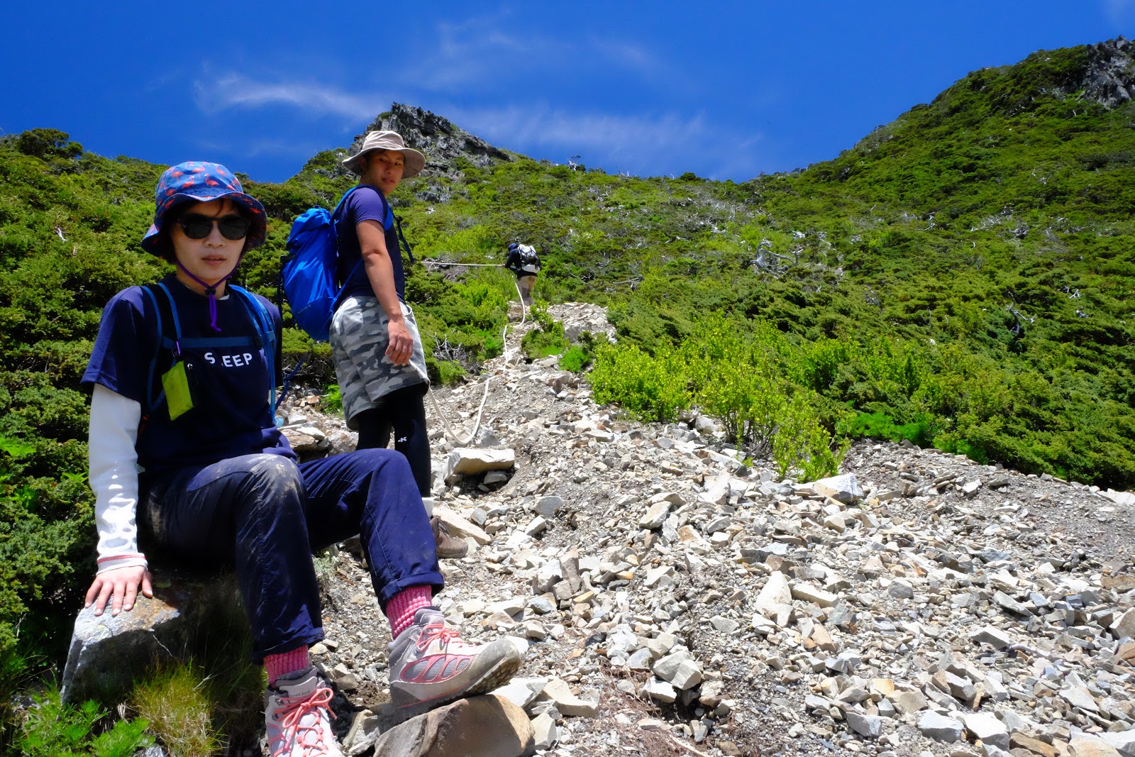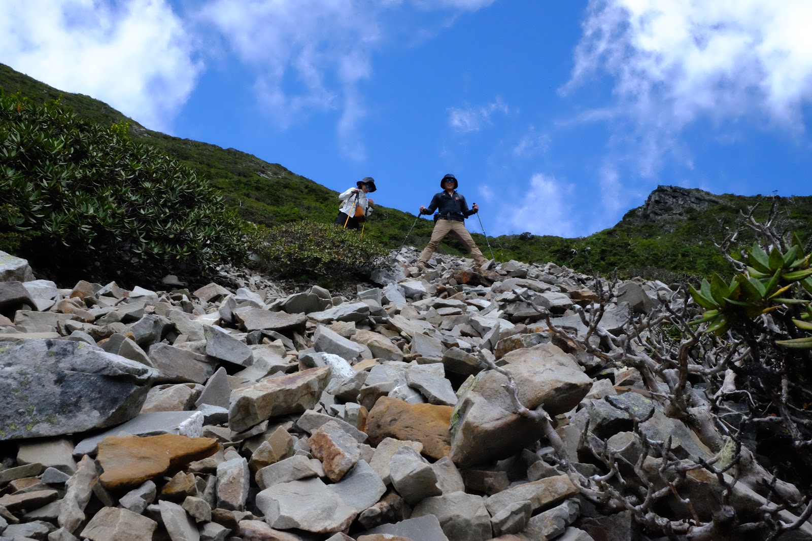 我們從碎石坡的右邊先下,這裡有落差比較大的地方都有拉繩可供使力,宋偉豪一馬當先手長腳長的就離我們好遠,再慢慢提點我們這些矮子踩點。但是因為石頭都不甚堅固、陡度又大,怕高的YO幾乎是哭喪著臉一路慢慢屁股往下。這裡就是要放大膽子邊下邊滑,重心往後、雙腳踩穩,不要因為太擔心摔倒而拼命往前看。