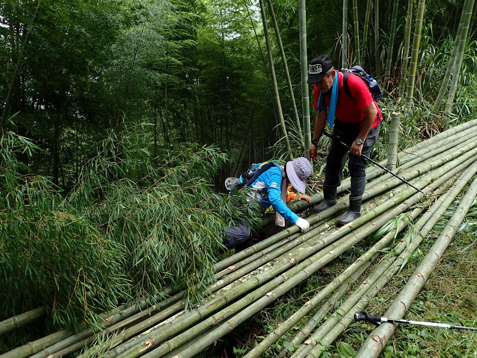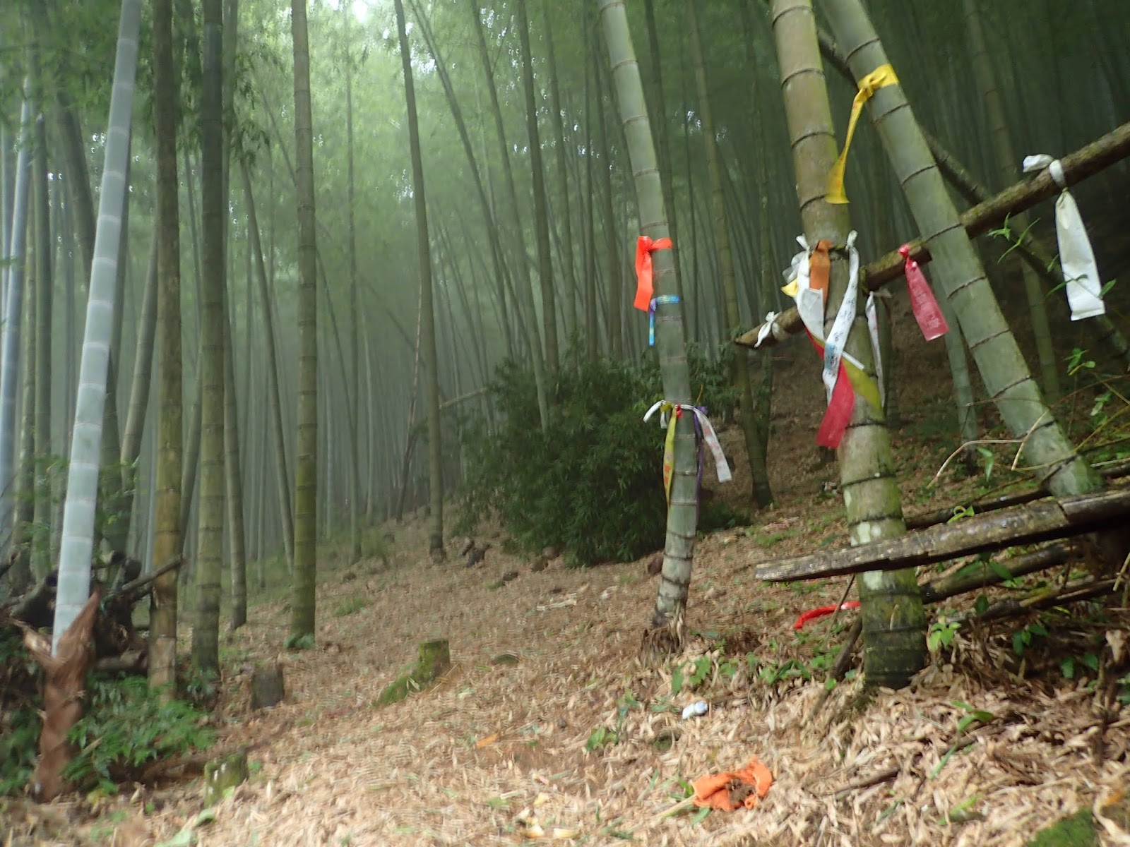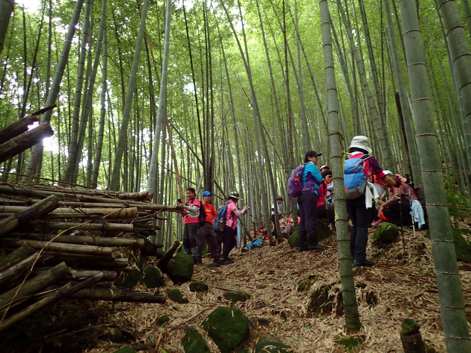 走出竹林, 路口堆放一堆竹子形成路障, 往上攀爬