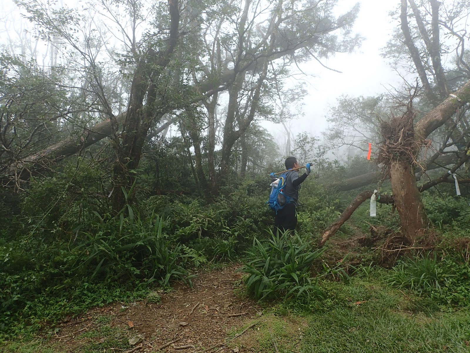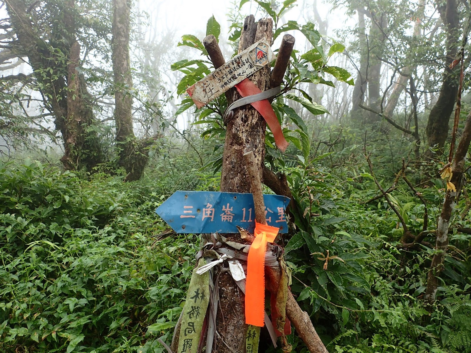 往烘爐地山指標在地上, 後面樹上還綁著登山隊的路標