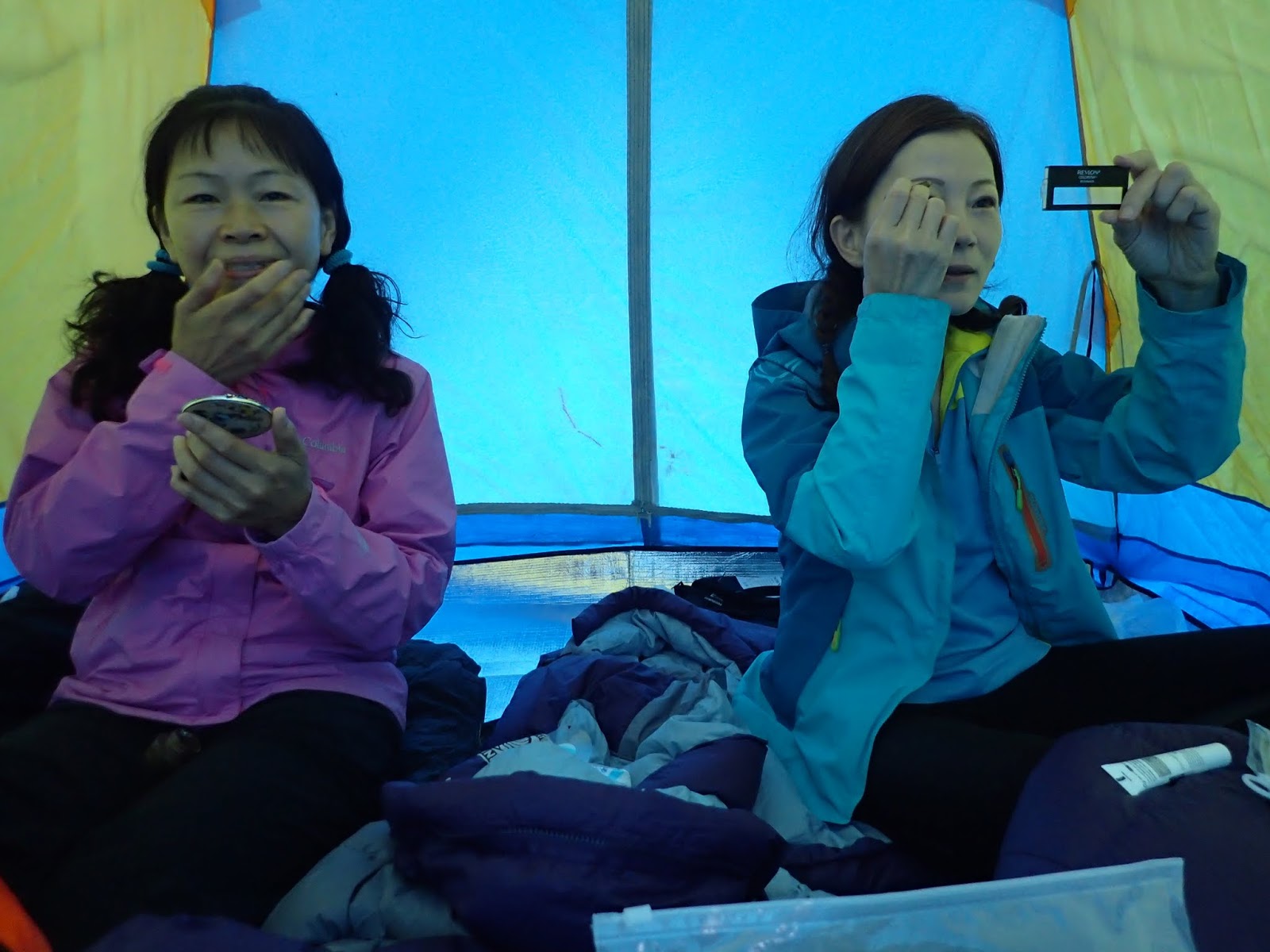 回到帳篷換電池, 兩位睡美人剛醒正在梳妝, 抹粉點胭脂