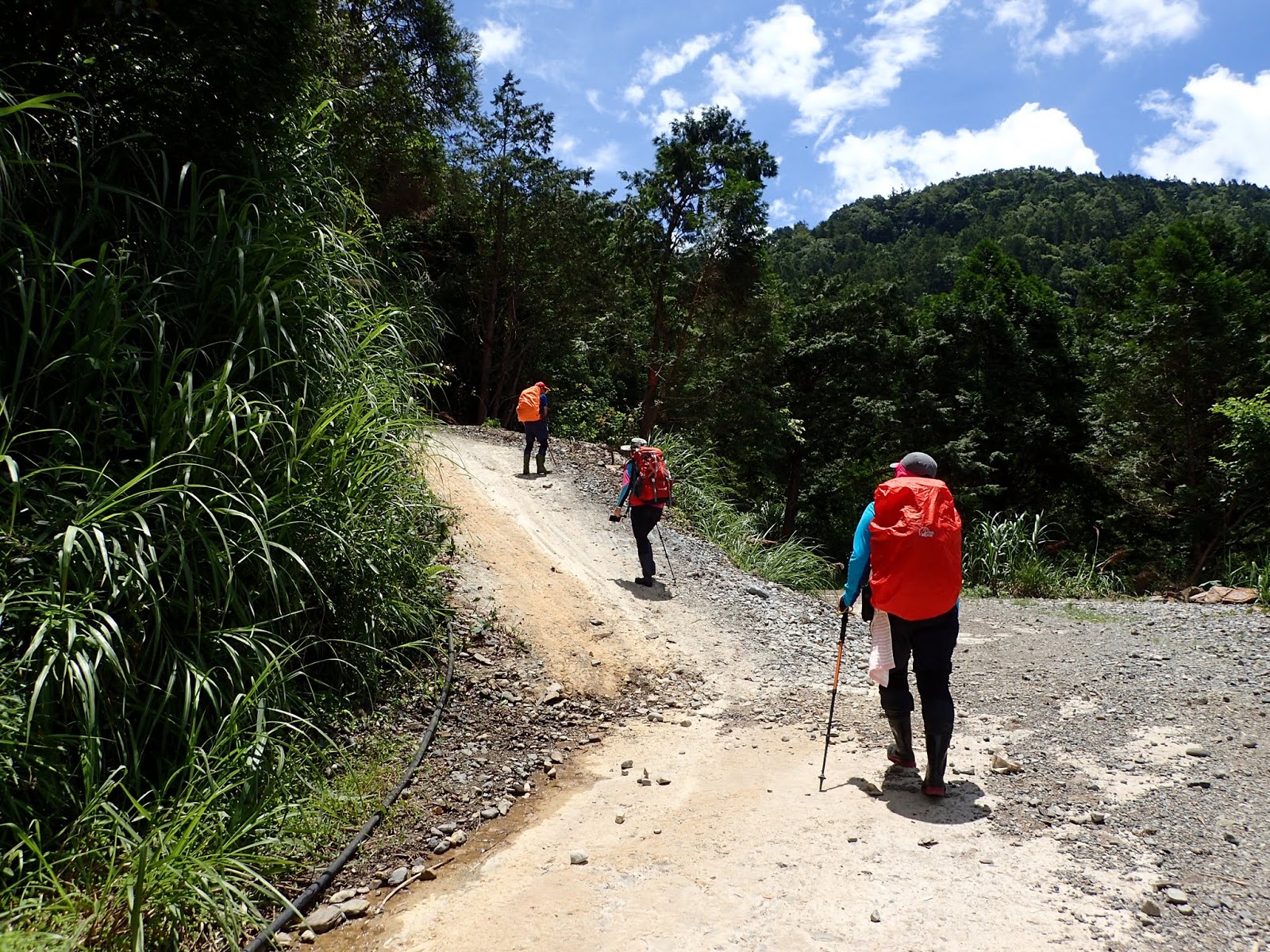 6:50 台北車站東三門集合後準時出發, 9:50四季社區轉坐貨車上四季林道, 10:10車子開到至盡頭柵欄入口下車, 全體到齊後發了中午的便當, 不想背重大家就地消滅, 10:30上路, 由此起登說還須走約四公里多的路才會到巨木登山口, 透中午豔陽下背重走在陡上的水泥石道簡直要老命