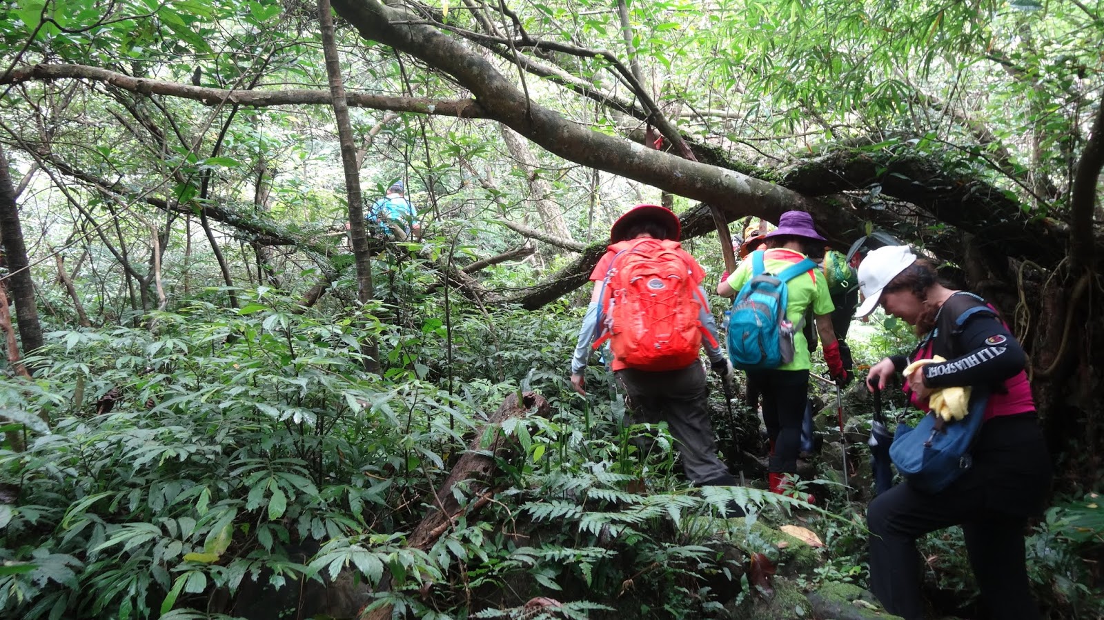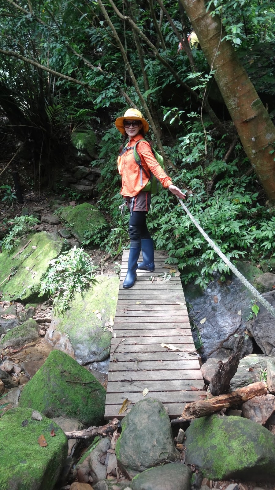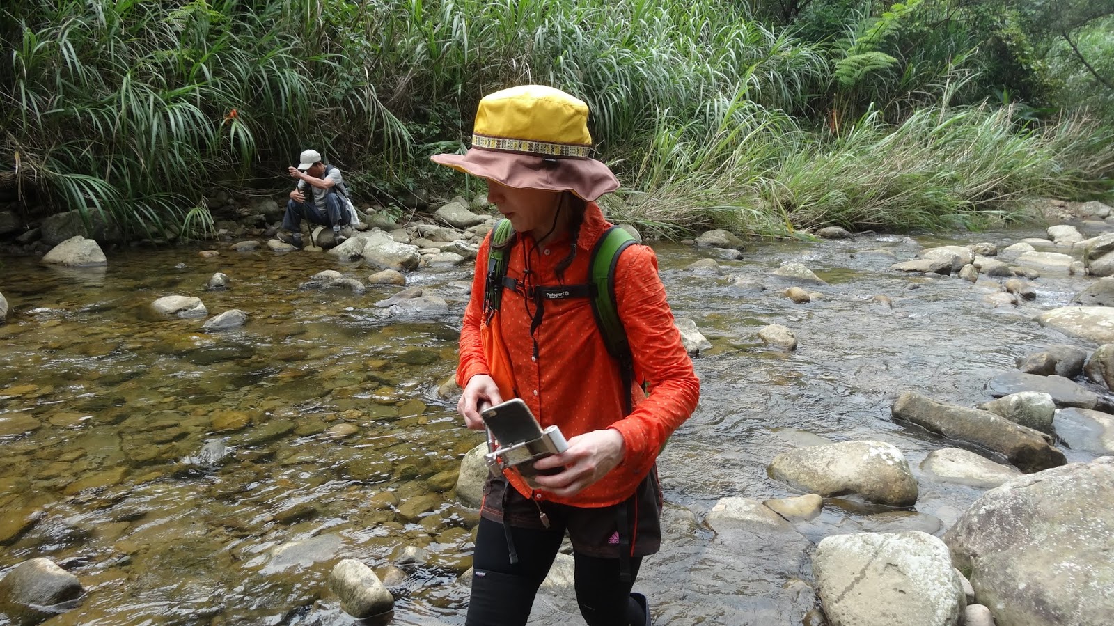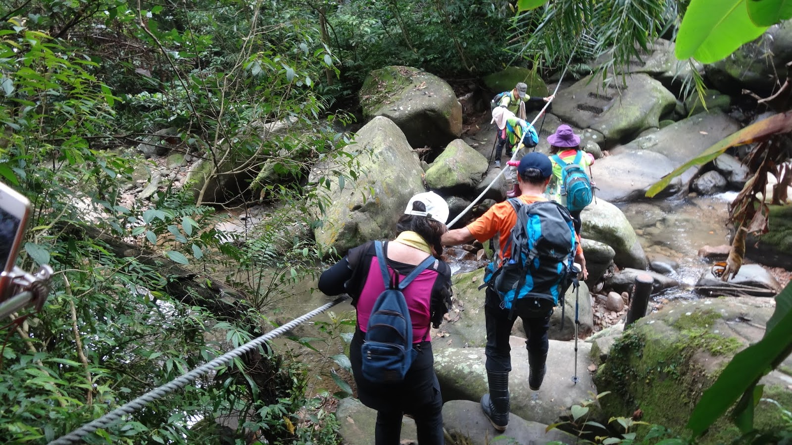 走一段路來到溪邊, 英明的領隊與大家商量後當機立斷決定循近路撤退, 好耶, 可以快點吃到龍膽石斑了
