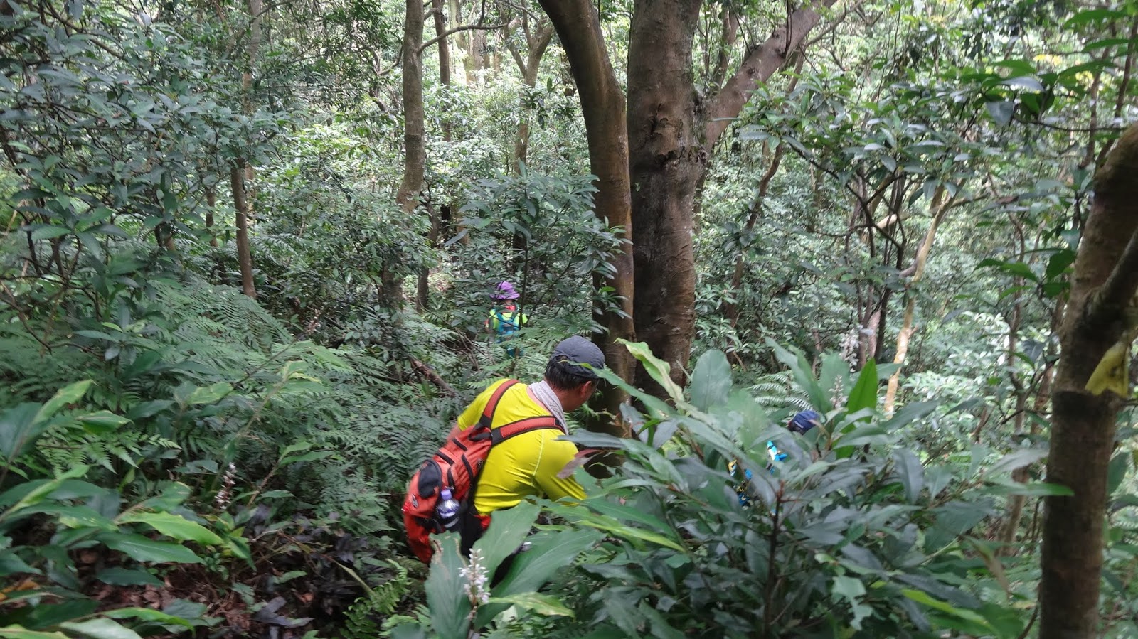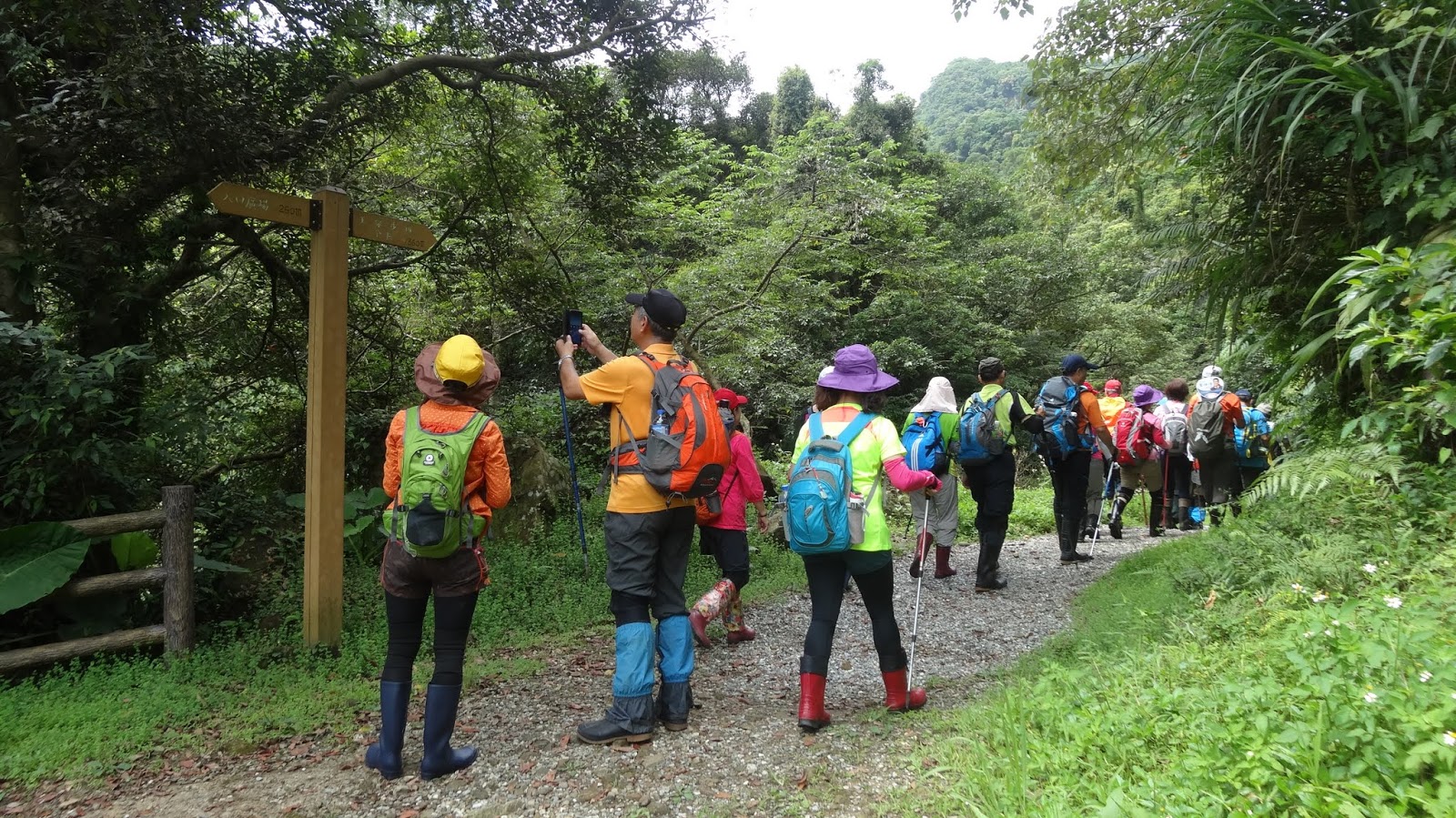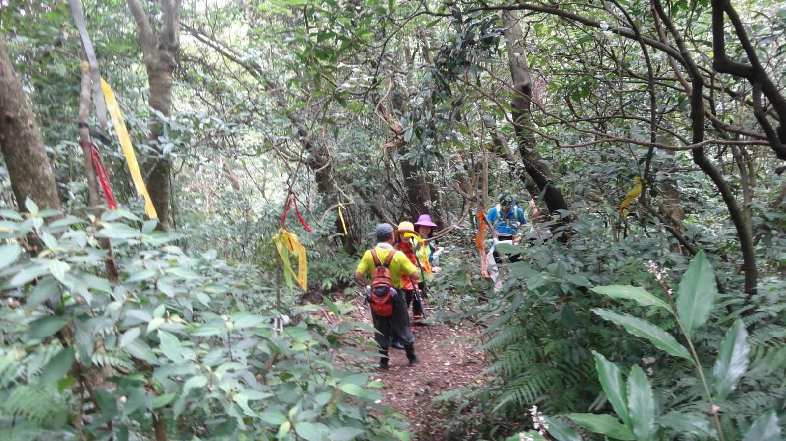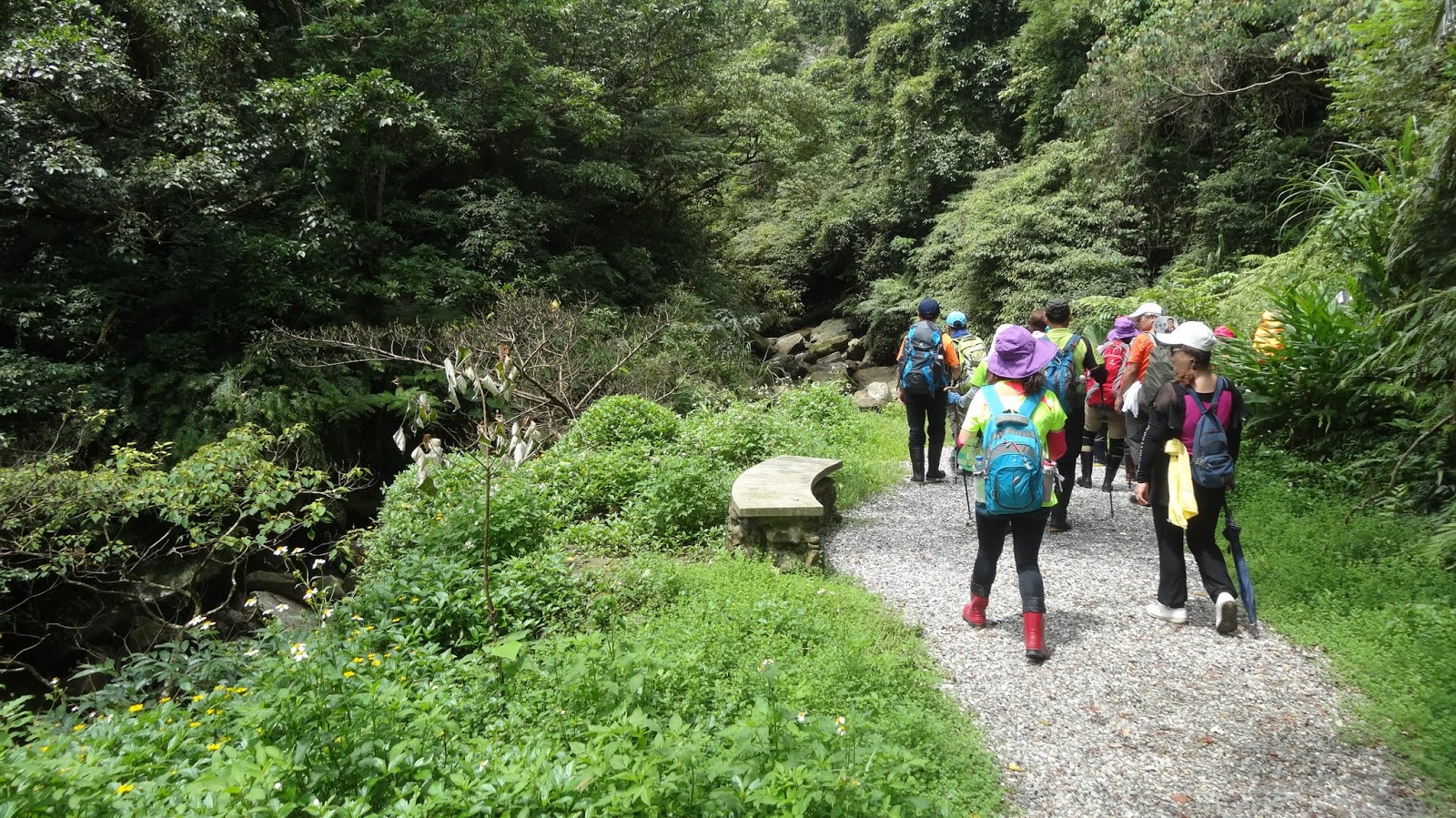 走一段路來到溪邊, 英明的領隊與大家商量後當機立斷決定循近路撤退, 好耶, 可以快點吃到龍膽石斑了