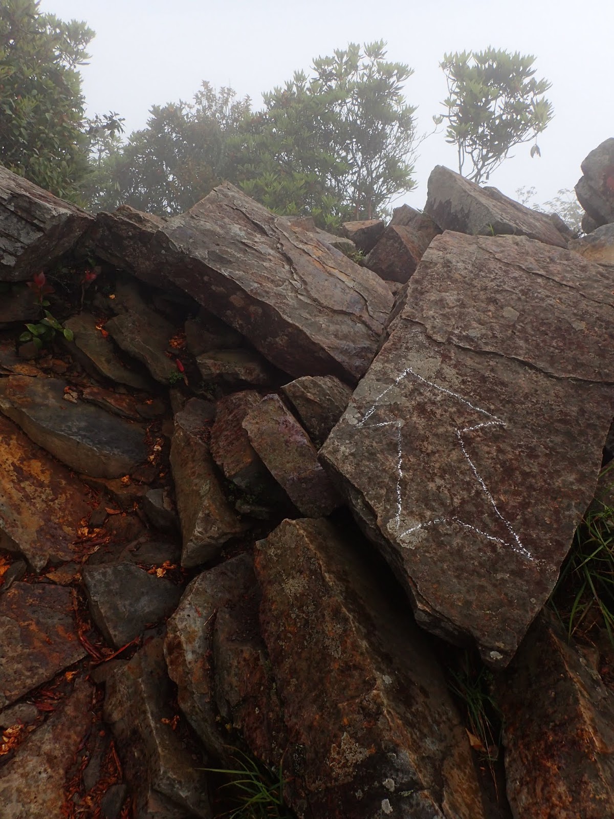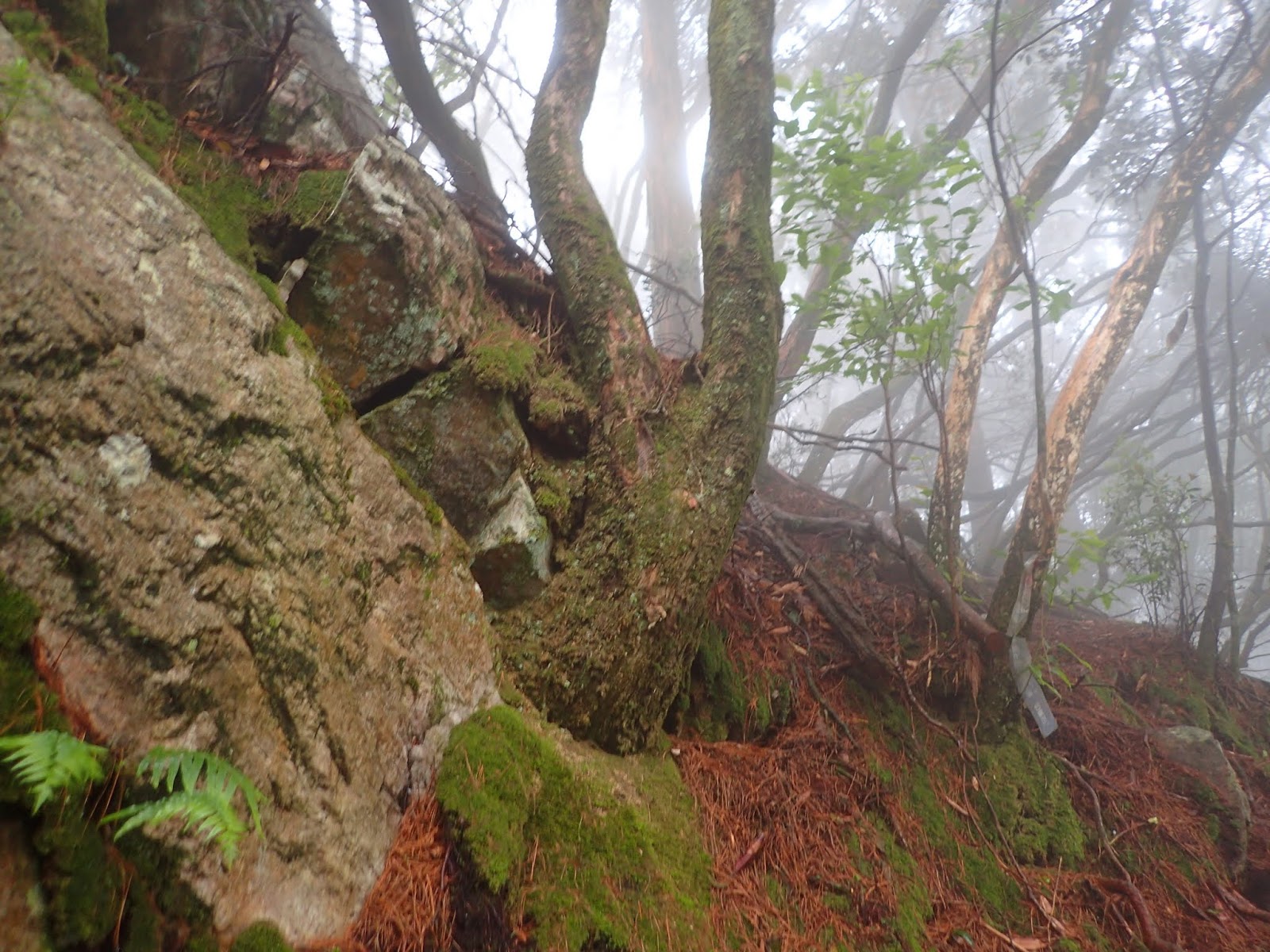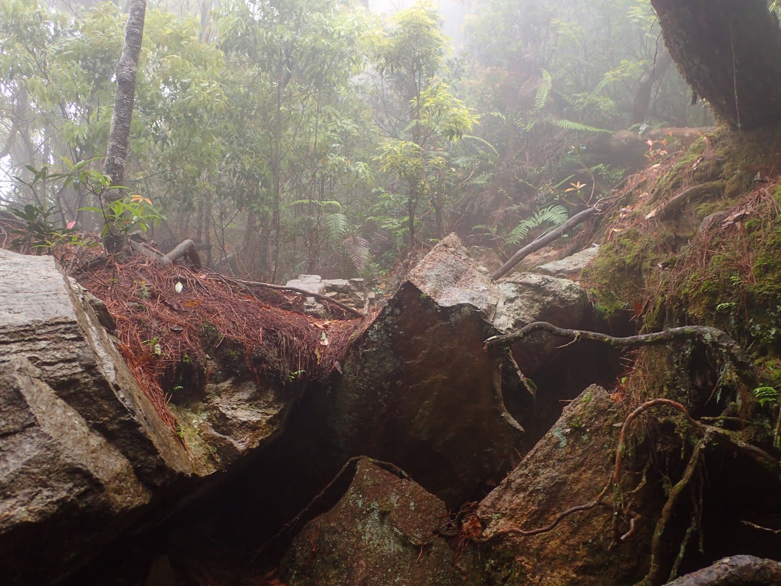 眼前只有尖稜峭壁大塊岩石, 岩壁外白茫茫的一片, 蒙蔽了我的雙眼, 拉著繩索, 腳踏著岩石, 突然感覺好像也沒甚麼恐怖好怕的, 彷彿吃下定心丸心裡篤定的很