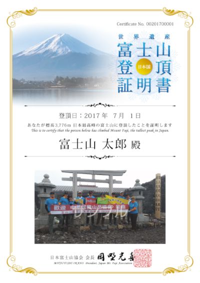 - 富士山登頂證明書 (Yamanashi Prefecture Official Certificate)