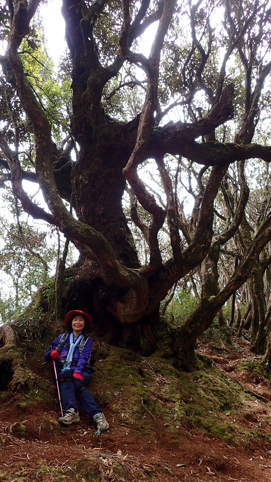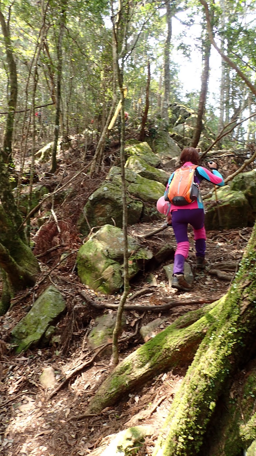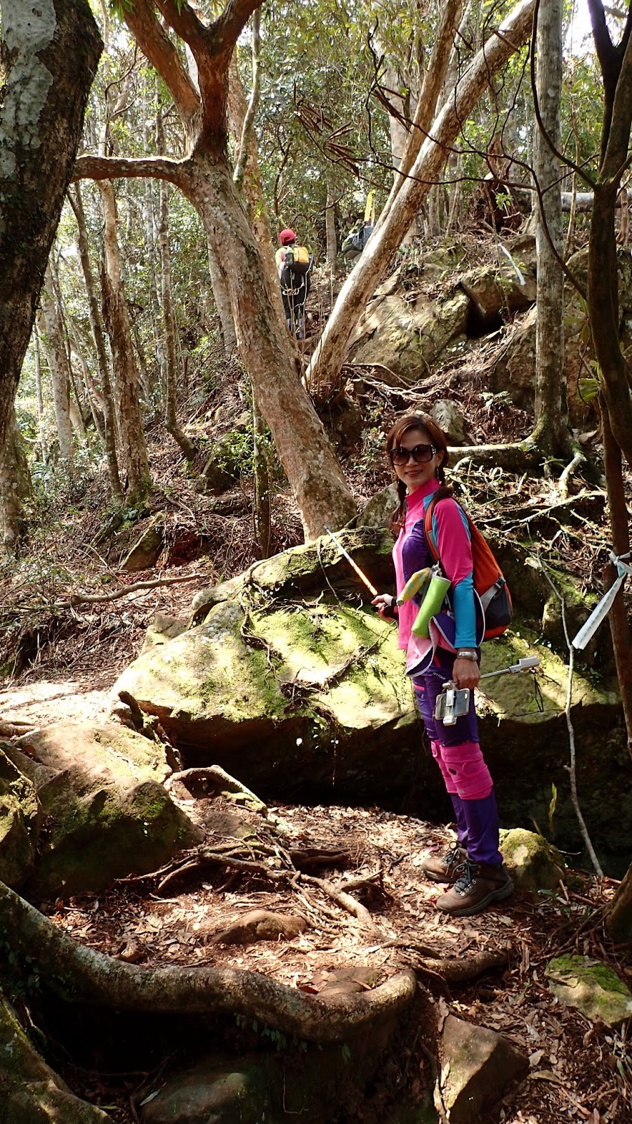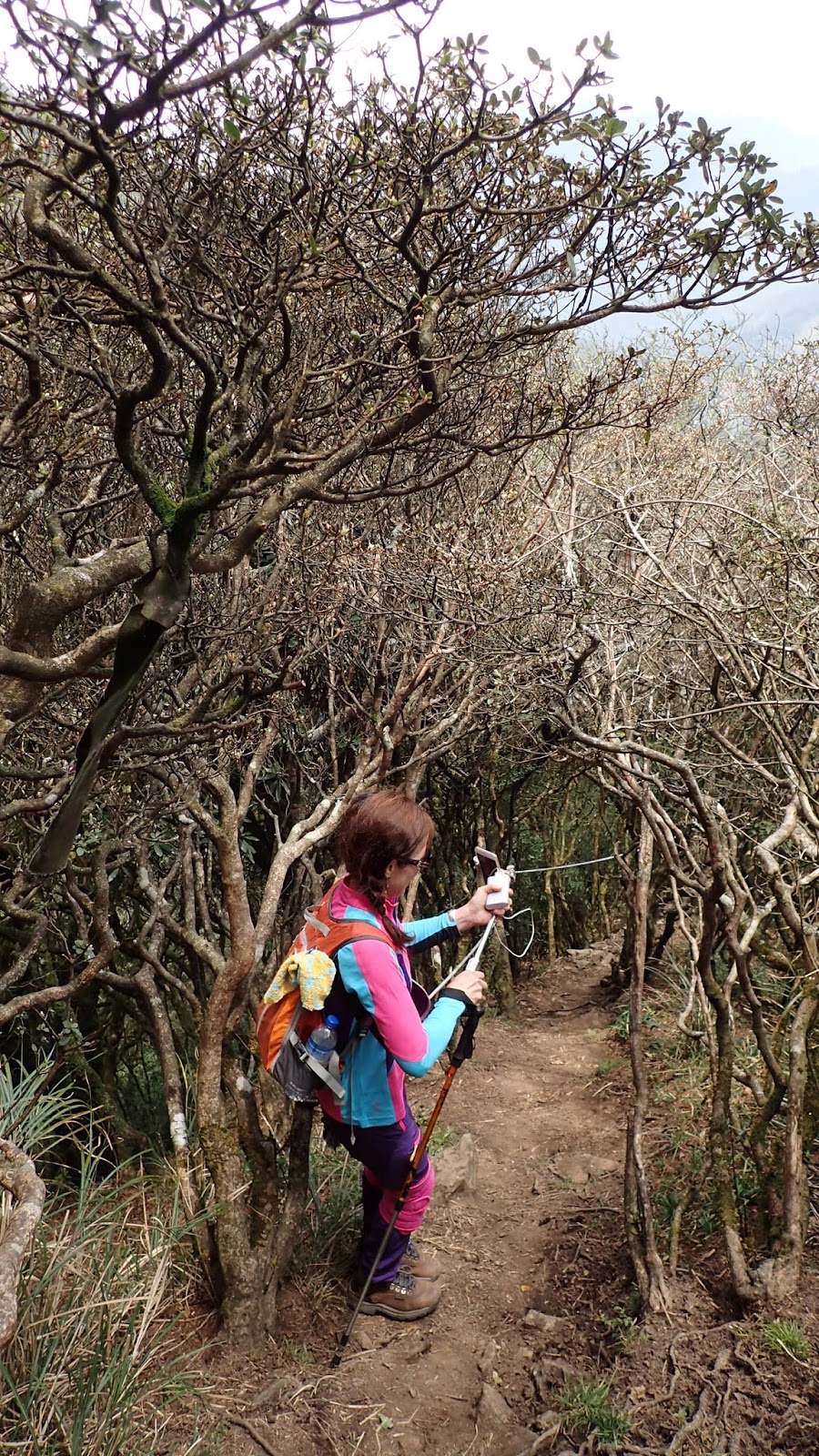 走在杜鵑林內, 一路上景致迷人充滿驚喜, 九段要我們繼續走, 說後面的人如果太晚到可能不讓他們上去了, 歐耶, 取得上加里山的通行證, 新認識的紅衣服姐姐也很喜歡拍照, 沿途幫我們拍好多照片, 瞧那拍照架勢, 專業認真