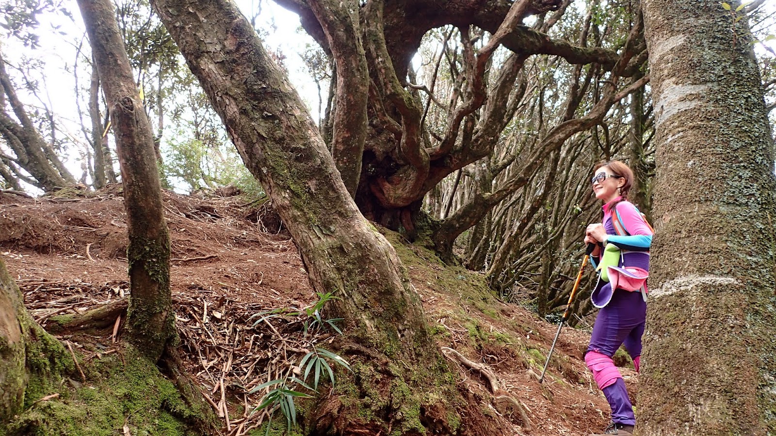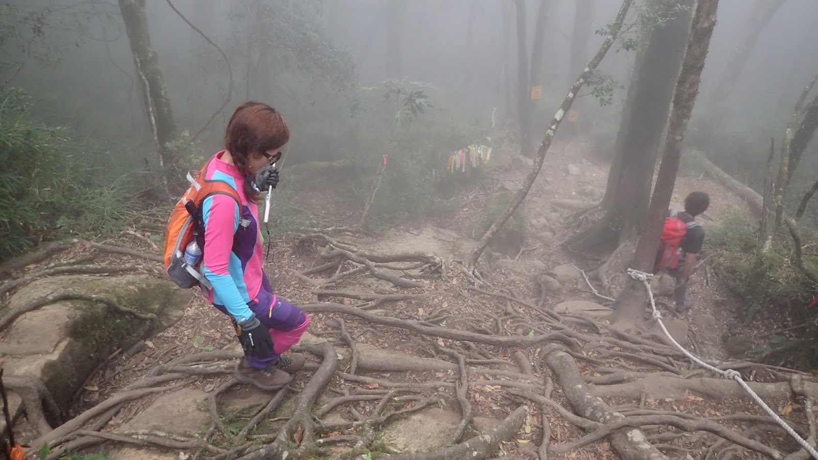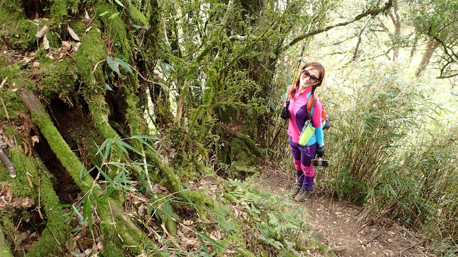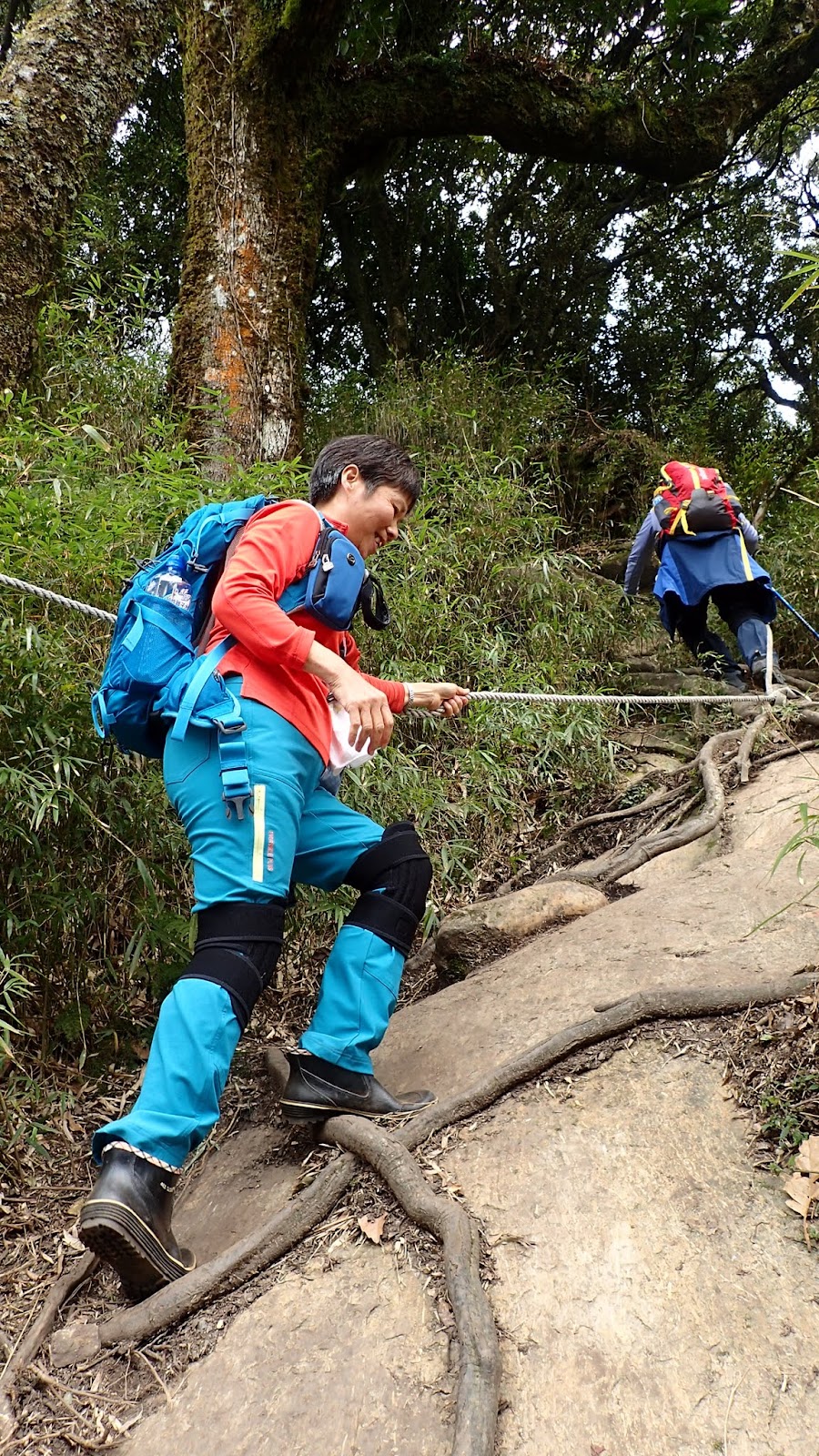 走在杜鵑林內, 一路上景致迷人充滿驚喜, 九段要我們繼續走, 說後面的人如果太晚到可能不讓他們上去了, 歐耶, 取得上加里山的通行證, 新認識的紅衣服姐姐也很喜歡拍照, 沿途幫我們拍好多照片, 瞧那拍照架勢, 專業認真