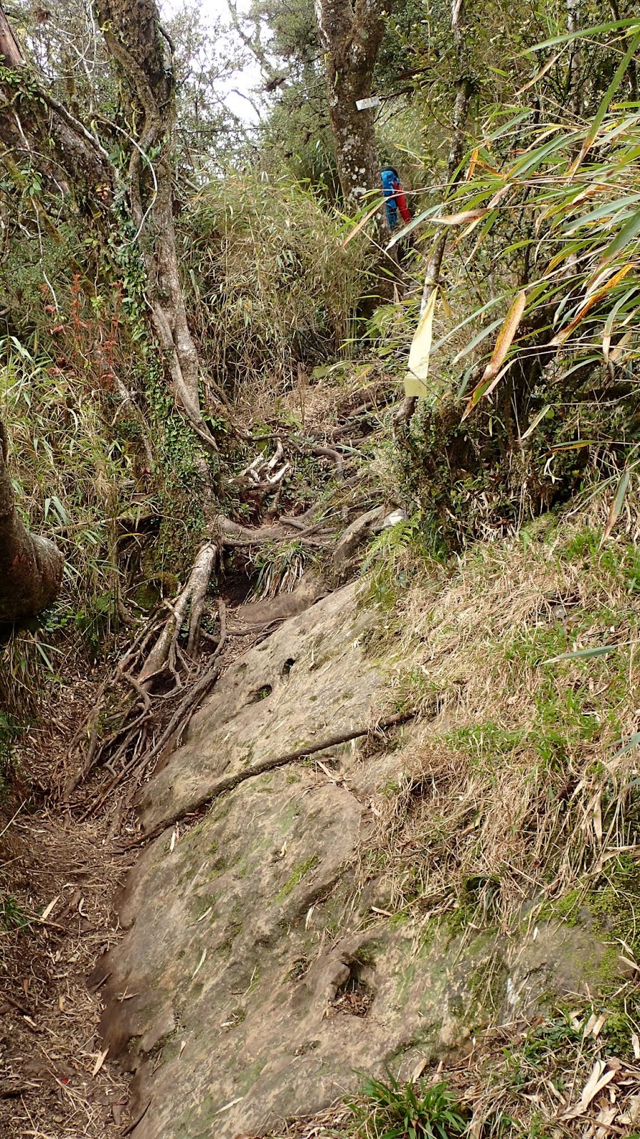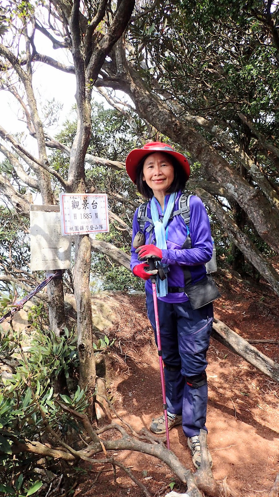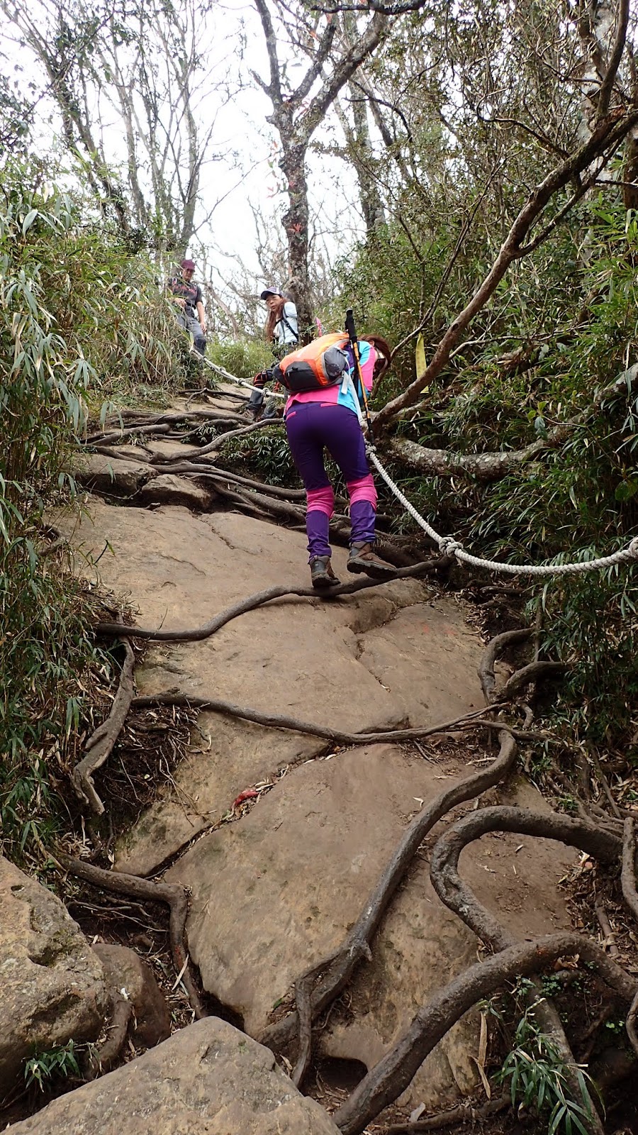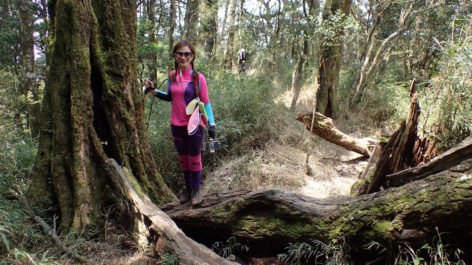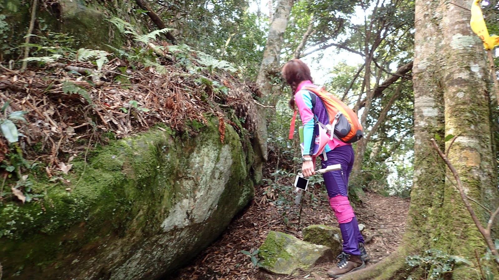 走在杜鵑林內, 一路上景致迷人充滿驚喜, 九段要我們繼續走, 說後面的人如果太晚到可能不讓他們上去了, 歐耶, 取得上加里山的通行證, 新認識的紅衣服姐姐也很喜歡拍照, 沿途幫我們拍好多照片, 瞧那拍照架勢, 專業認真