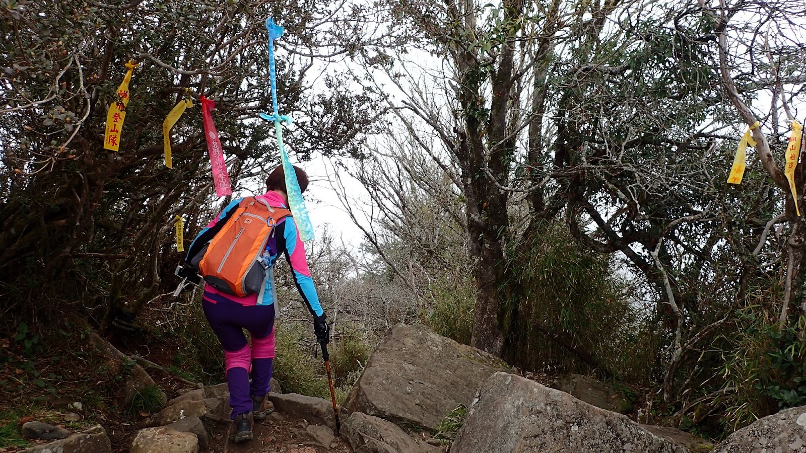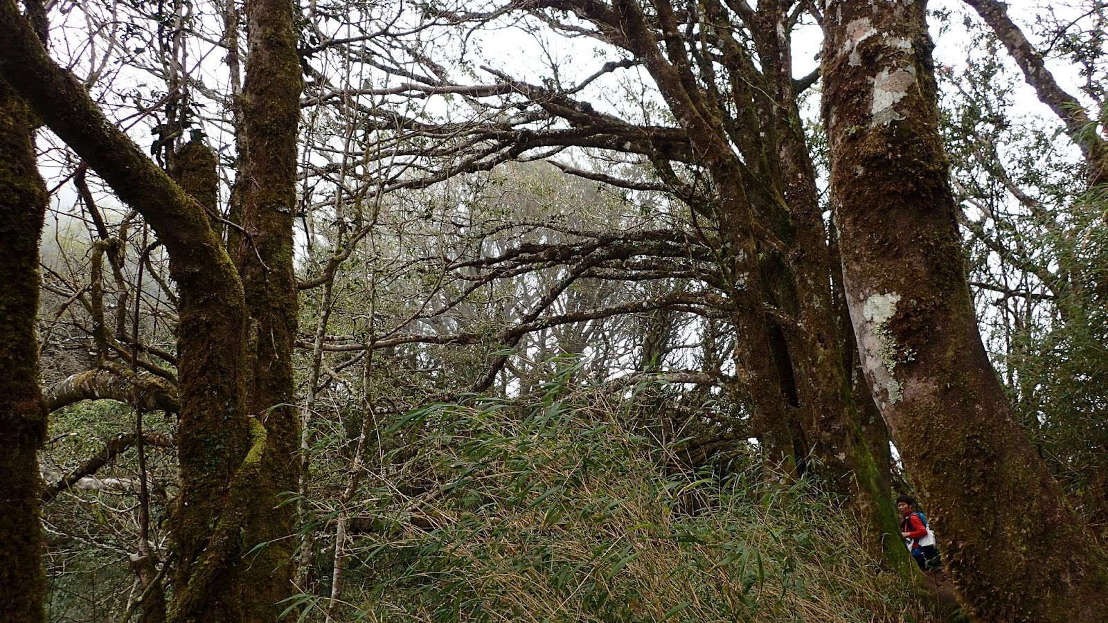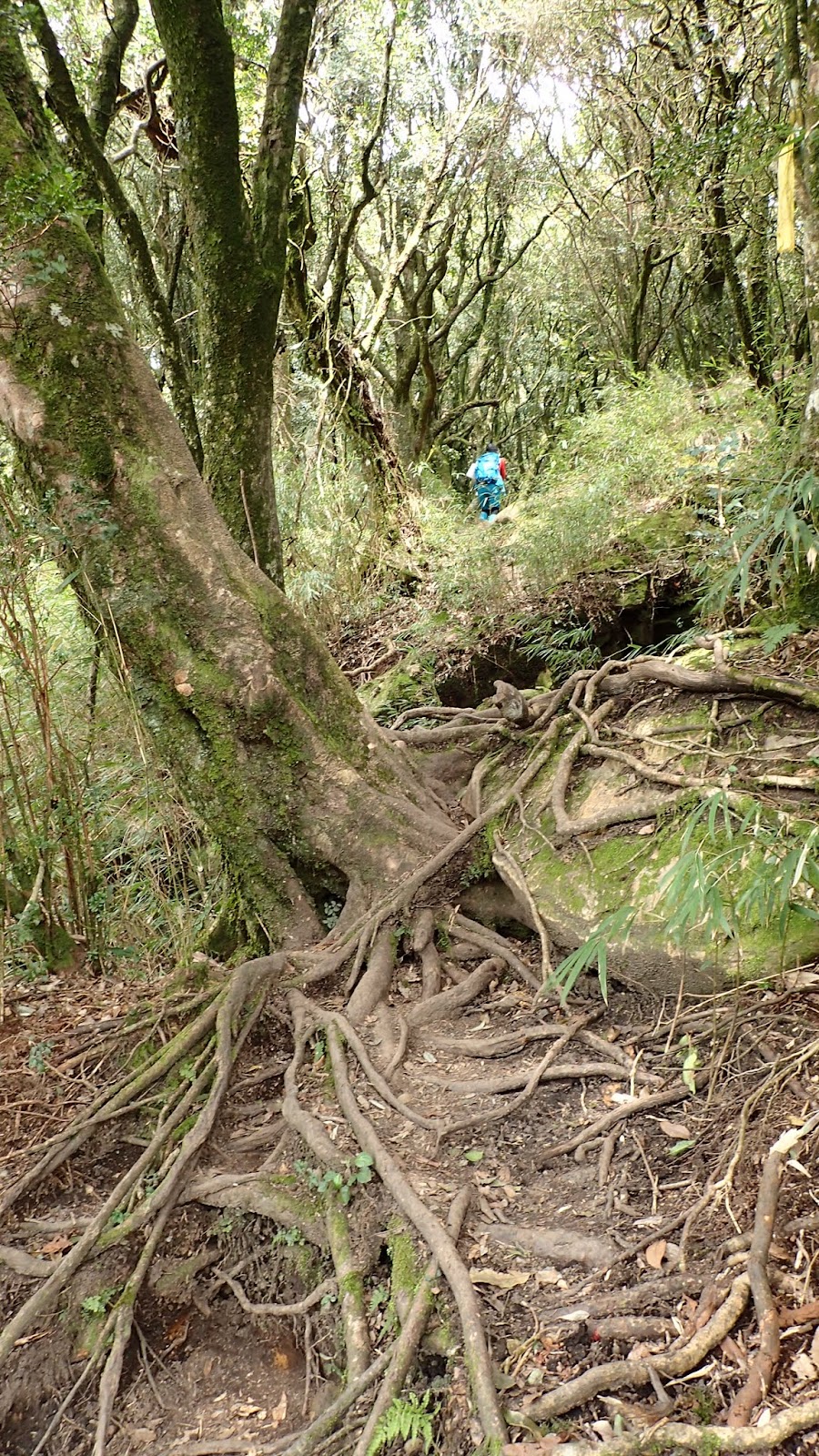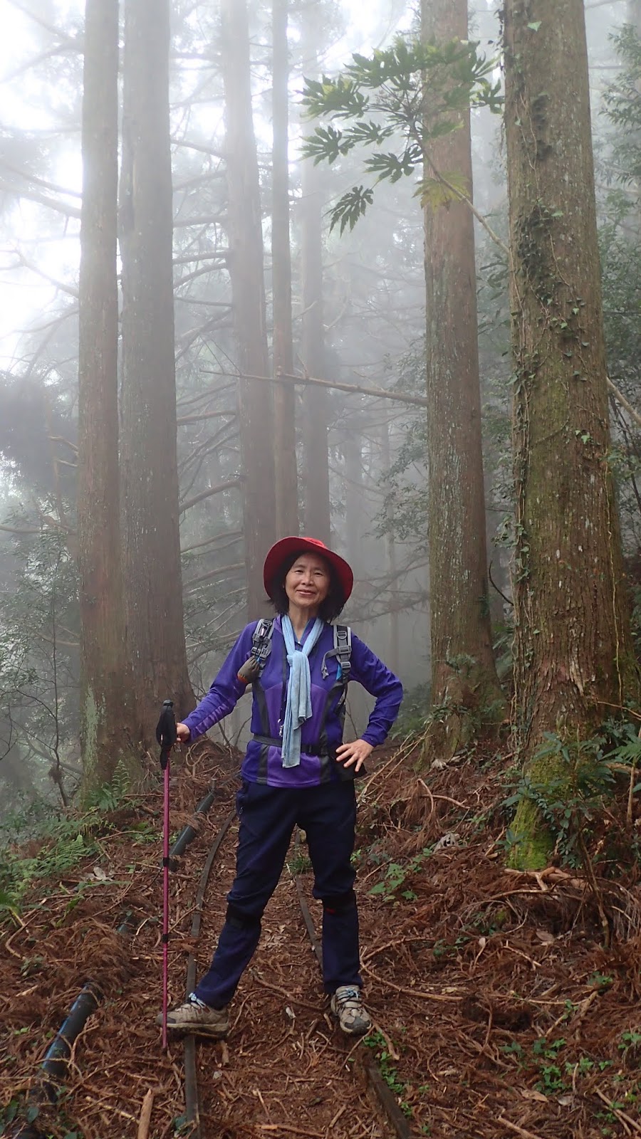 走在杜鵑林內, 一路上景致迷人充滿驚喜, 九段要我們繼續走, 說後面的人如果太晚到可能不讓他們上去了, 歐耶, 取得上加里山的通行證, 新認識的紅衣服姐姐也很喜歡拍照, 沿途幫我們拍好多照片, 瞧那拍照架勢, 專業認真