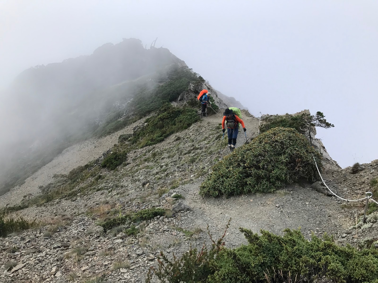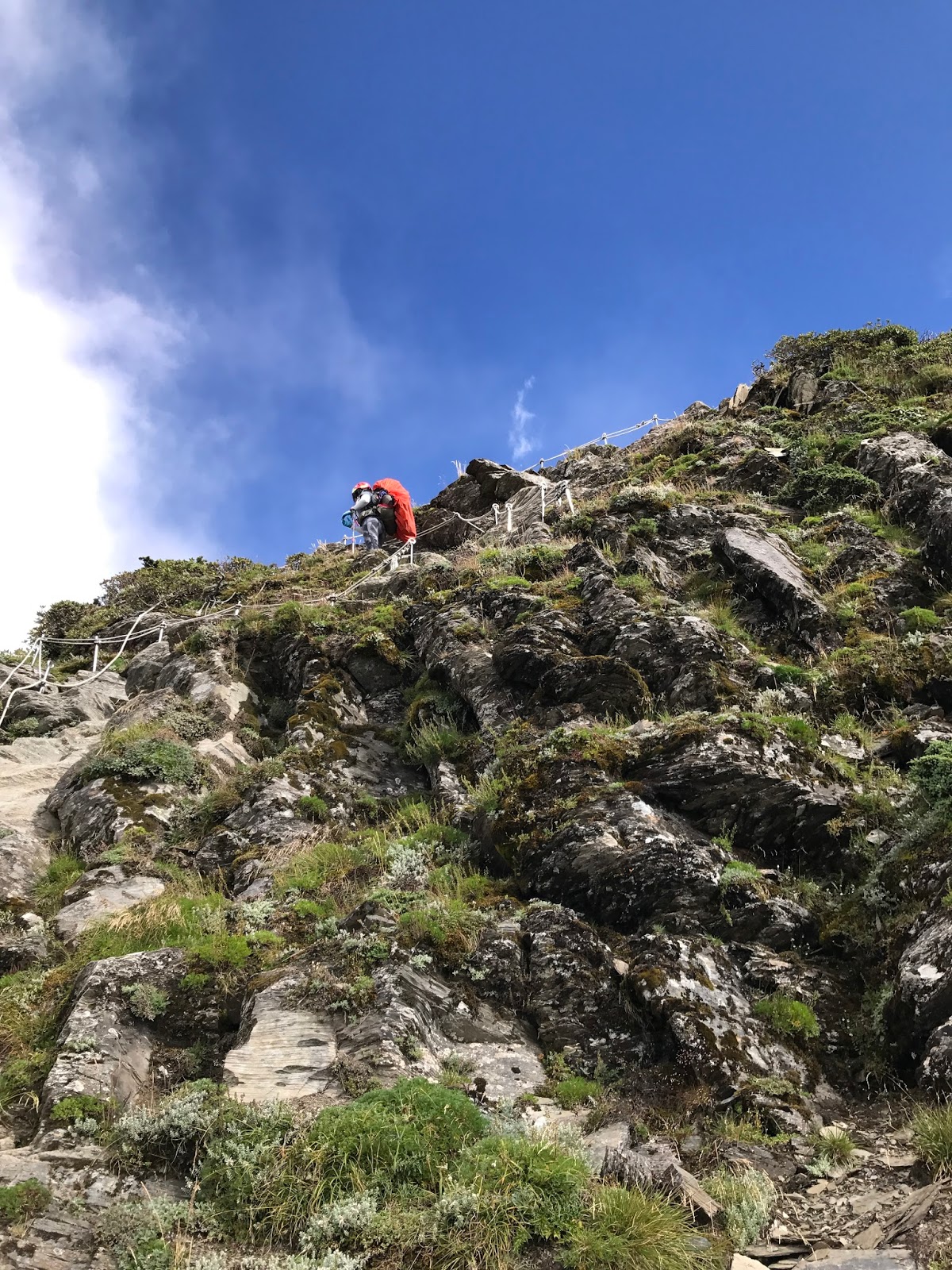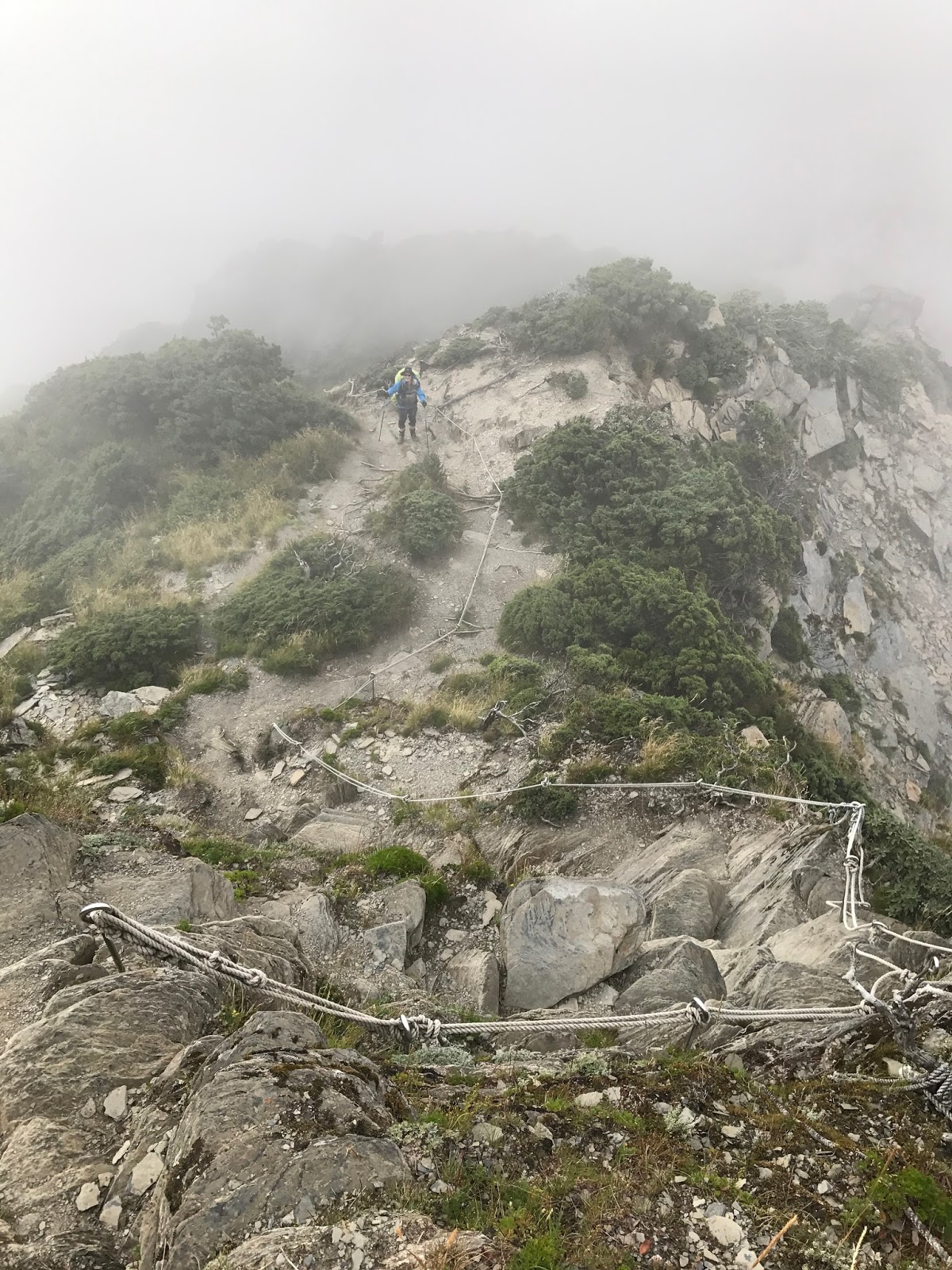 15:31可能是運氣真的很好!!幾乎沒甚麼風,不過左側就是碎石斷崖,有些地方需跨到繩子另一邊,踩點是斜的片岩,對穿登山鞋的人沒雨算是幸運,撿到了。因為氣象一直說會下雨!!!幸好幸好