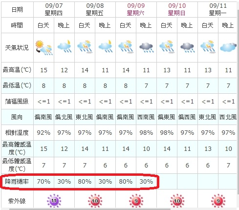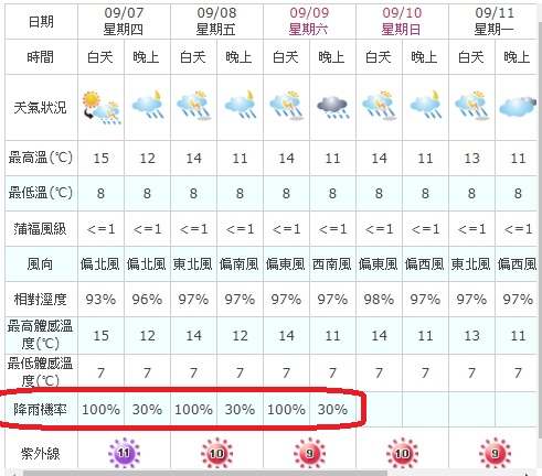 雖預報80-100%降雨,但運氣好所幸沒遇到@@指有一天遇到小雨。