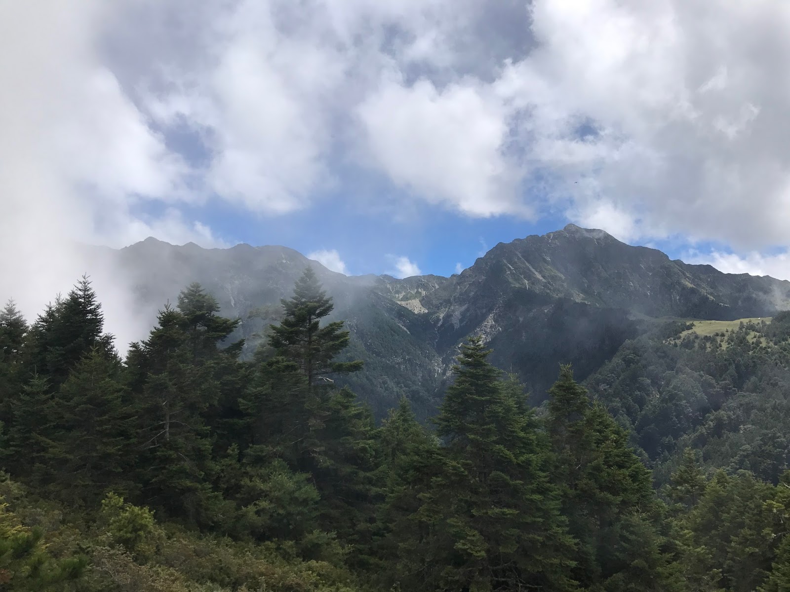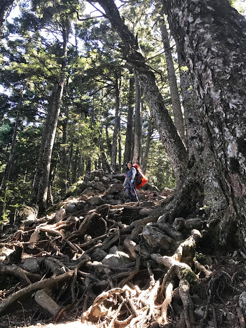 09:20上坡大概一個半小時就到較平坦的針葉腹地可在此作休息用餐!隨後是樹根及碎石相伴的路況!!一路踏出去便可看到五連峰、南湖主峰及中央尖山。天氣還不錯!!