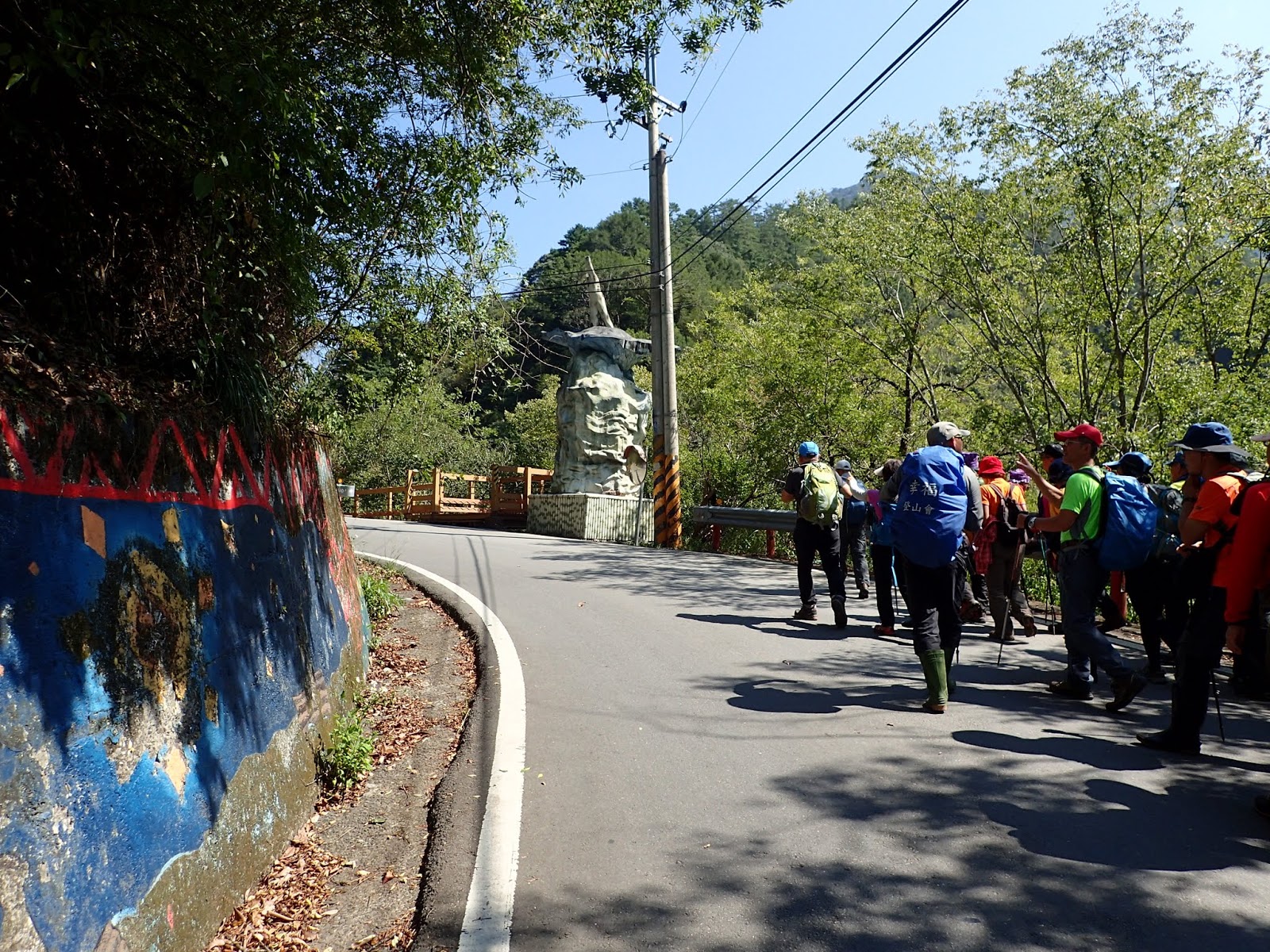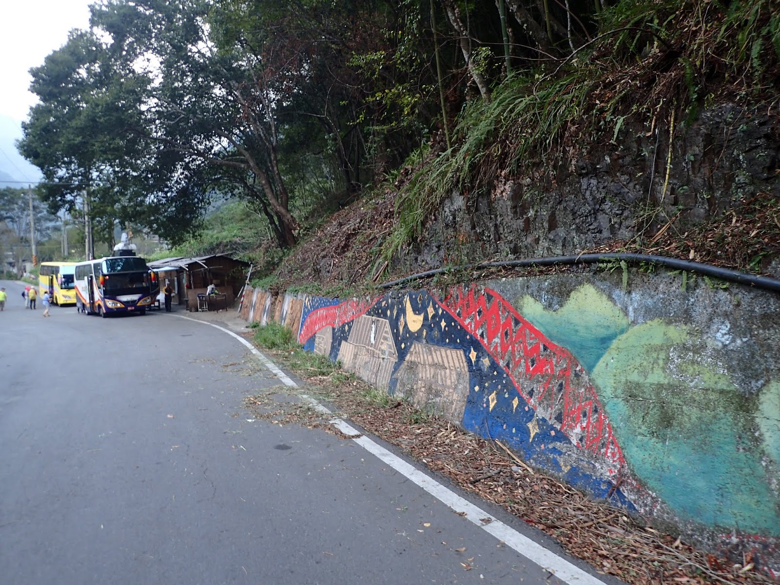 部落的彩繪獨具特色, 小巴就在前方等著, 吃了山友請的小西瓜後換上乾爽的衣服