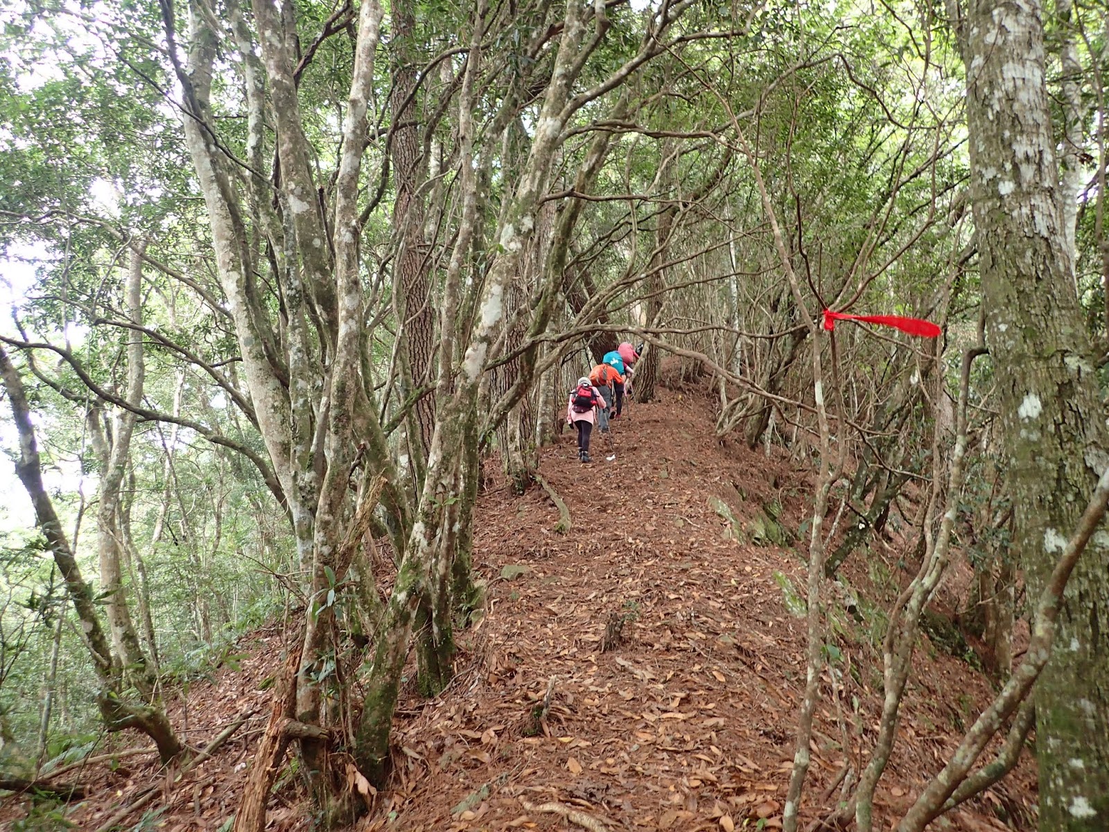 登山口的高度大約700公尺, 一路陡上至芝生毛台山是1789公尺, 落差超過1000公尺, 可想而知回程就是陡下了, 單想就腿軟, 領隊帶我們走一條新闢的山路, 路跡不是很明顯也不好走