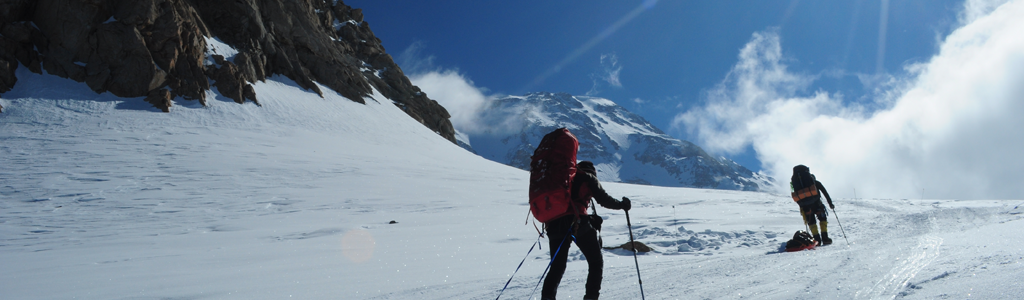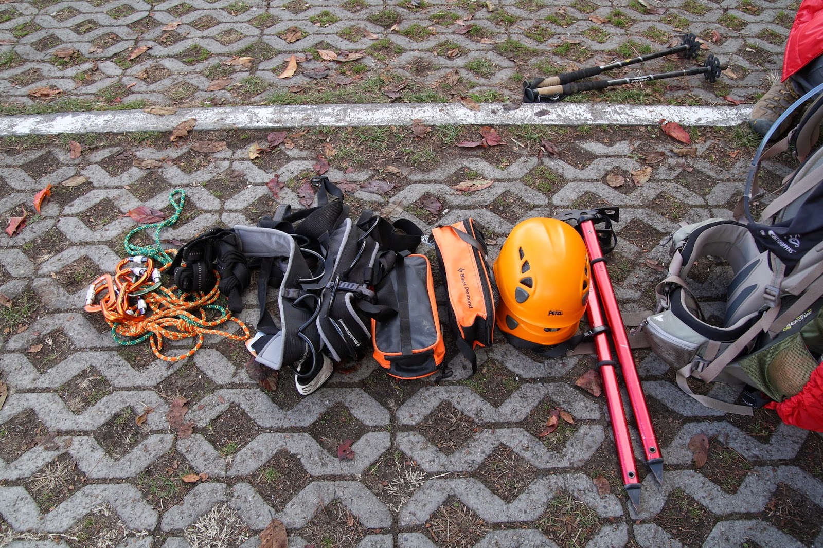 裝備如下:安全帽、普魯士繩,工作腰帶、大D環,冰斧、冰爪。