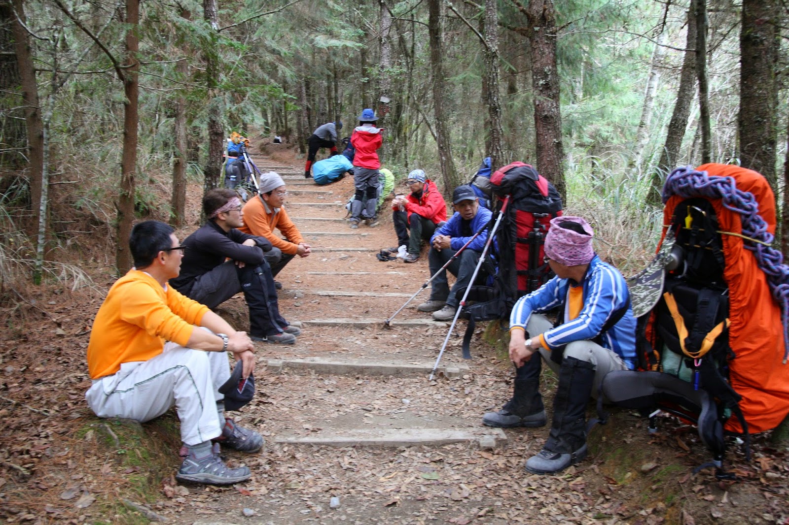 來到 1k 處,大伙休息喘個一下,右邊那藍紫色公莊主繩就重達5k,要是我分到...我應該住七卡山莊就不想上去了。