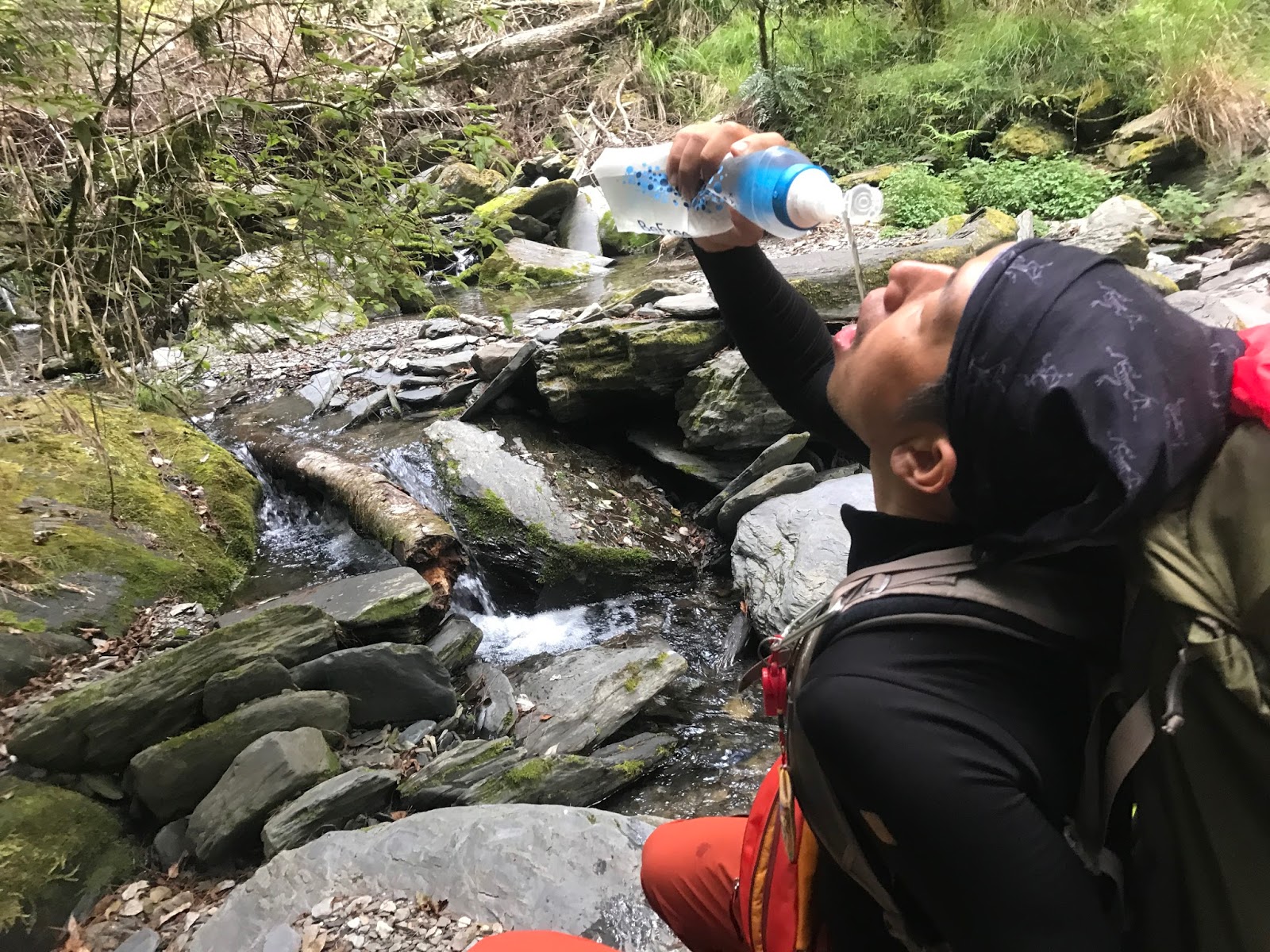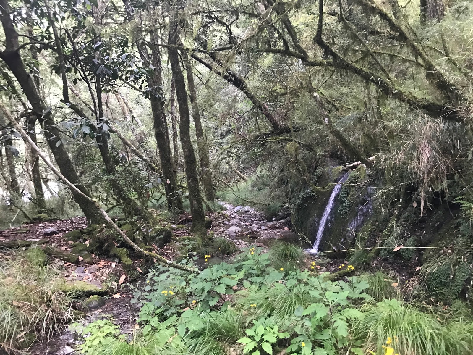 指示牌過後往上爬升時,左邊還有活水,另外翻過去下坡路段,也會經過一處溪流,這邊算是最後水源!再來要繼續陡上,到最高點後,下切看到拉繩就到南湖溪山屋了!!