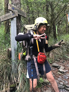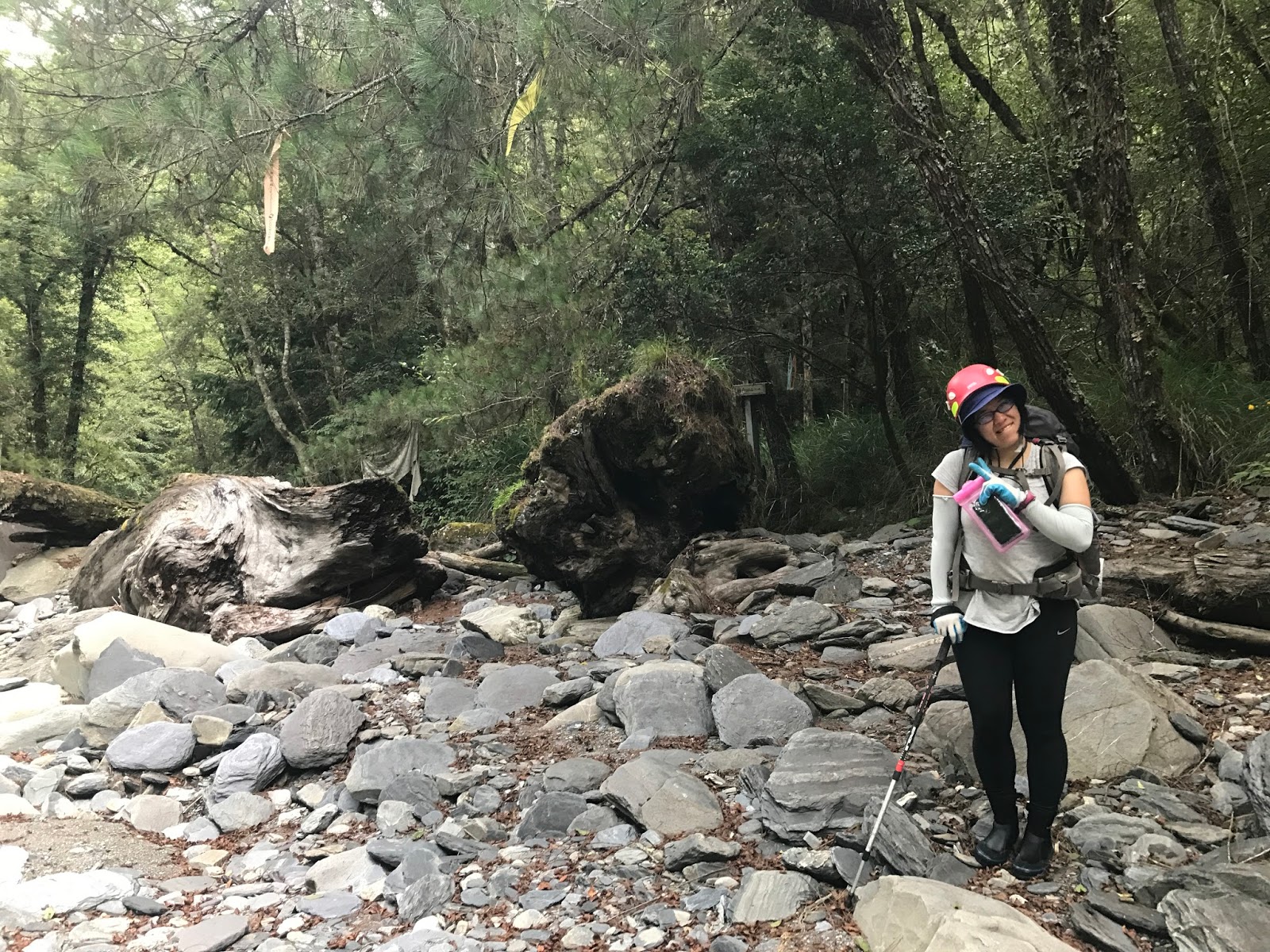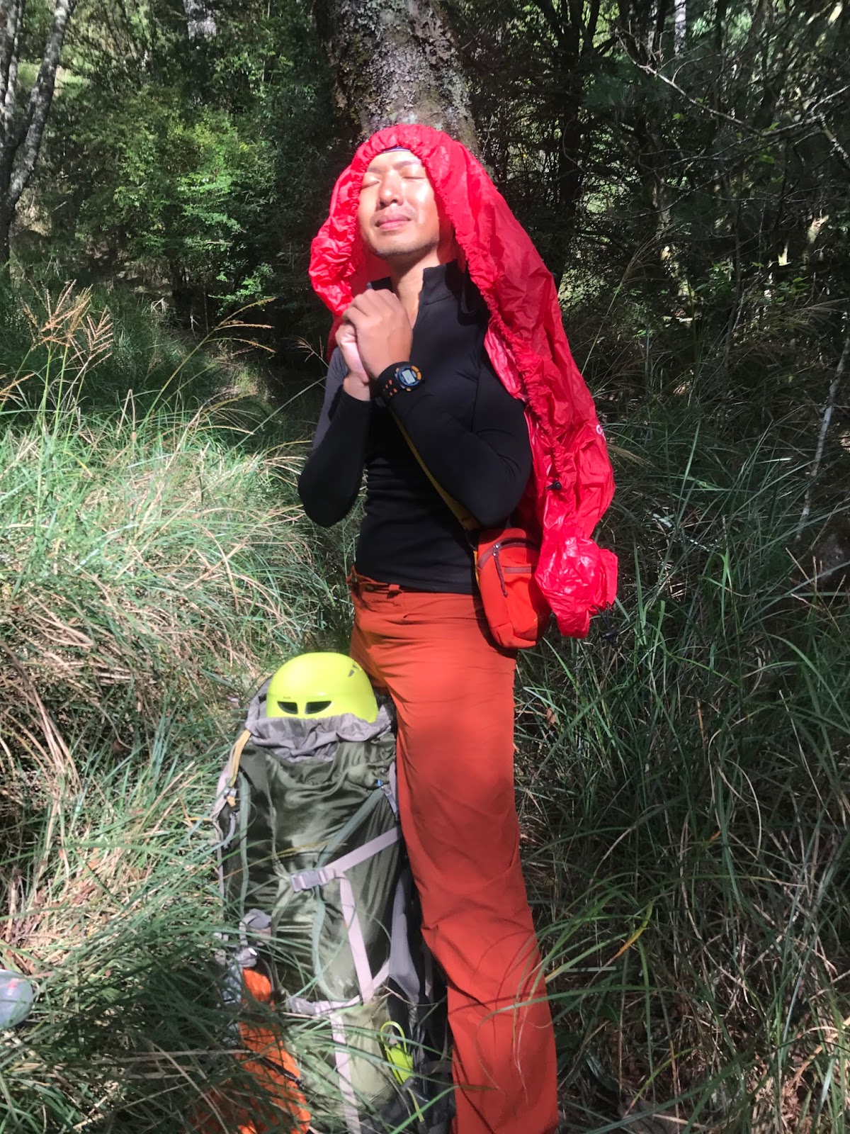 岩盔:全路段碎石、岩石、樹根、箭竹林很多!!手腳撞傷都還可行動!但頭部受傷基本就是原地等待救援了!為了降低風險,帶習慣成自然!!這次有跌到中央尖溪幸好沒撞到。