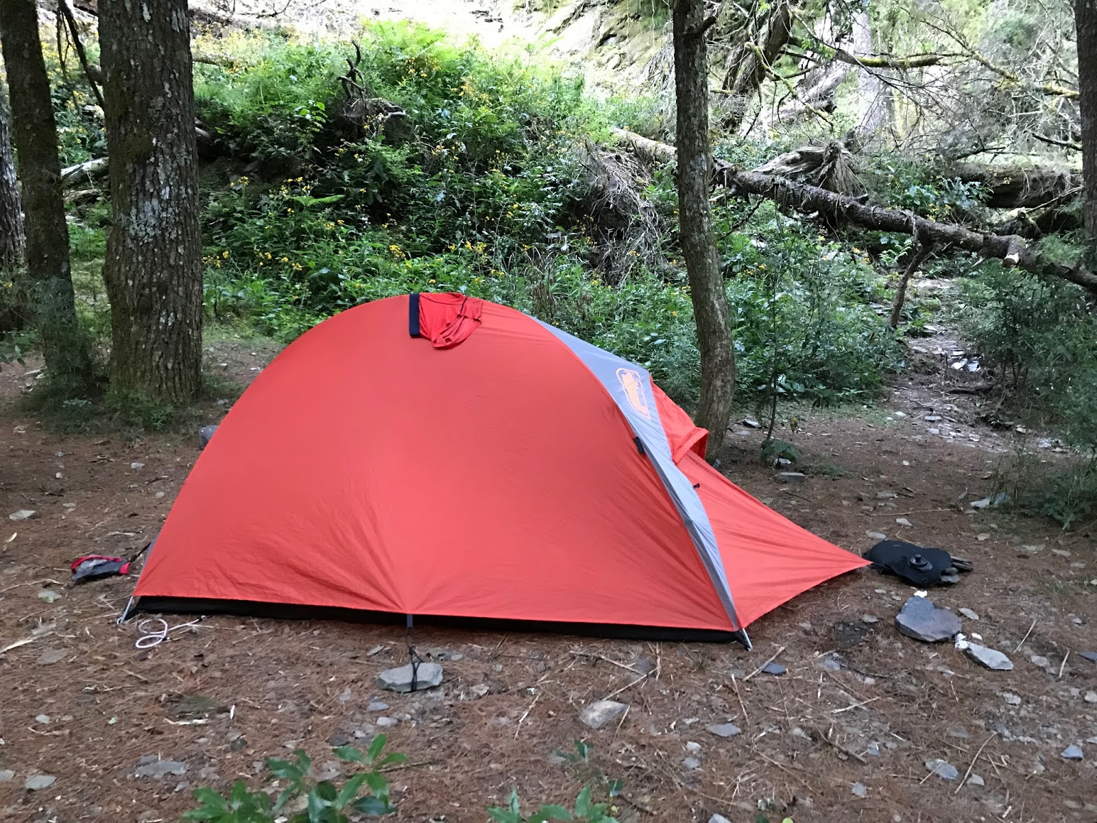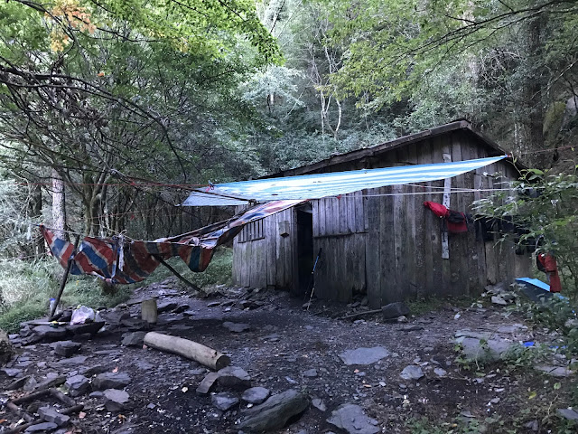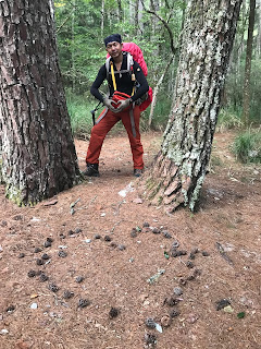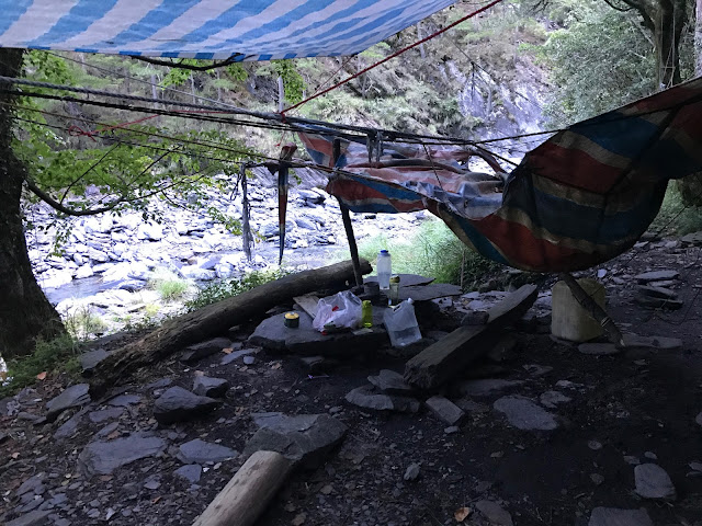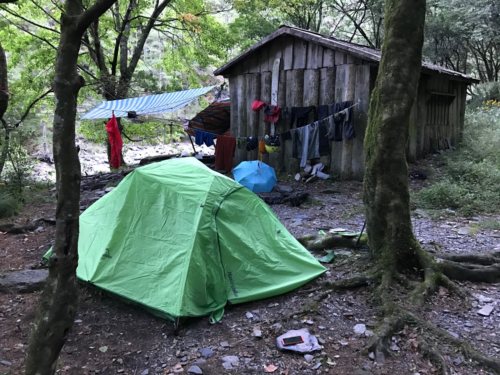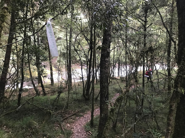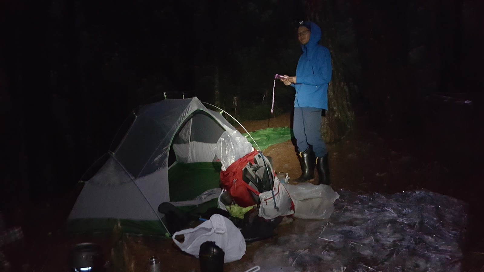 由於領隊與阿裕大哥行程不同,三角點拍完後就趕快下山要往南湖溪山屋與我們會合,但實際上可能時間太趕!朔溪找路花了點時間,到香菇寮營地已經開始天色昏暗!就地紮營過夜!!原本還在找尋香菇寮到底在哪GPS找阿找!其實紮的地方就是了!