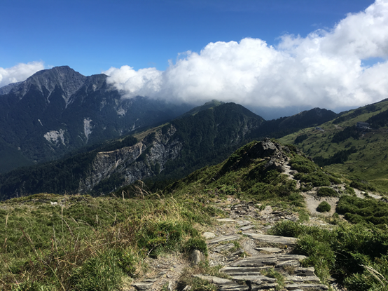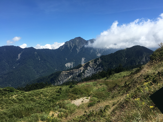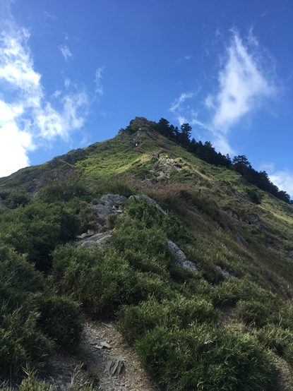 石門山走完之後就換合歡尖山,尖山其實就是一座很尖的土丘,一面是長長的樓梯,一面是陡坡岩壁,要用坐著的慢慢走下來,垂直海拔直接上升的快,所以也是走得要死要活。