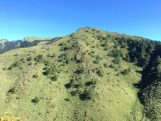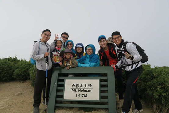主峰的前面一段路也很陡,又陡又窄,走一走又落後脫隊了,然後又一度眼前空白快要看不到路,只好讓後面路人先走,在路旁等到意識恢復清晰後再繼續前行。山上這時候開始起霧,越走越冷,風也很大,可是我還是呼吸不到甚麼氧氣,直到這時候,我才發現氧氣真的是很重要的元素,住在平地沒有感覺,高山上風就算再大,大口吸氣氧氣的濃度依舊不足,每走一步路都是痛苦,明明路就很好走可是速度還是拉不上來。幸好後段是產業道路,算好走緩慢上坡,登頂時遇見一對夫妻帶兒女上來爬山,年紀大概是國小一二年級那種,蹦蹦跳跳的拿著零食請我們吃,興奮的時候還會尖叫。我已經嘴唇發紫坐在旁邊動彈不得了,這兩位小朋友完全沒事的跑來跑去,還拿包蝦味先給我吃,頓時心裡覺得自己真是奧肖連。