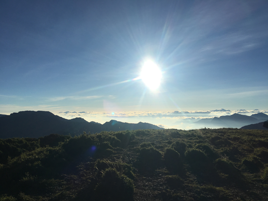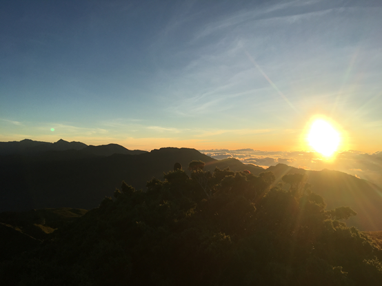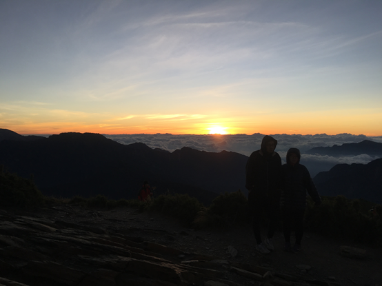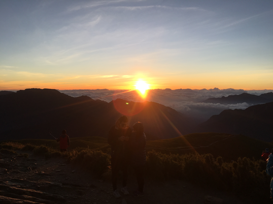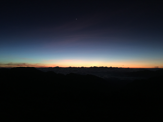 隔天戴著頭燈,全副武裝開始爬山。凌晨真的很冷,應該五度而已吧,要戴手套。不過前一天早早睡,睡得比第一天好,醒來完全整個精神很好,結果即使這麼早出門爬北峰,反倒沒有遇到第一天的高山症。爬山的時候全部都是黑漆漆一片,只有頭燈照的地方是亮的,北峰很陡,不過直到天亮下山時才發現他真的非常陡峭。天上的星星很美,走一走日頭快要出來前會變橘黃色的光,照在雲海上,那是天快要亮之前的安靜時刻。靜靜地走,很像是來到另一個國度。我很難用言語去形容這個景象,手機拍不起來這畫面,這是很神奇的氛圍,大地準備要醒過來的時候。