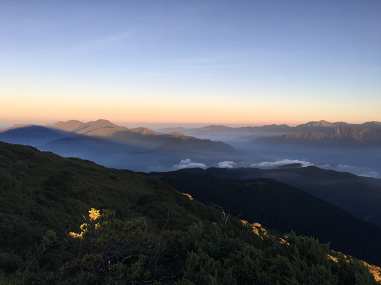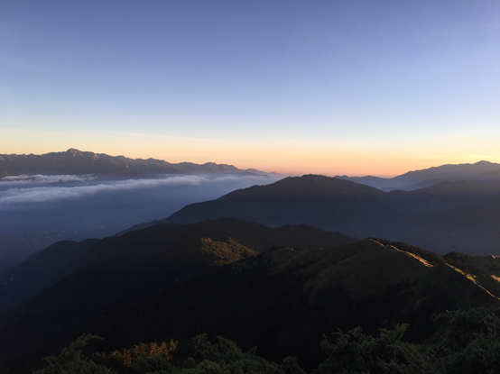 這時候在山的另一邊,沒有太陽升起的另一邊,雲海飄在山間,藍藍灰灰的,很像水墨畫,真的就像是用毛筆畫上去的山水墨畫,特別美。