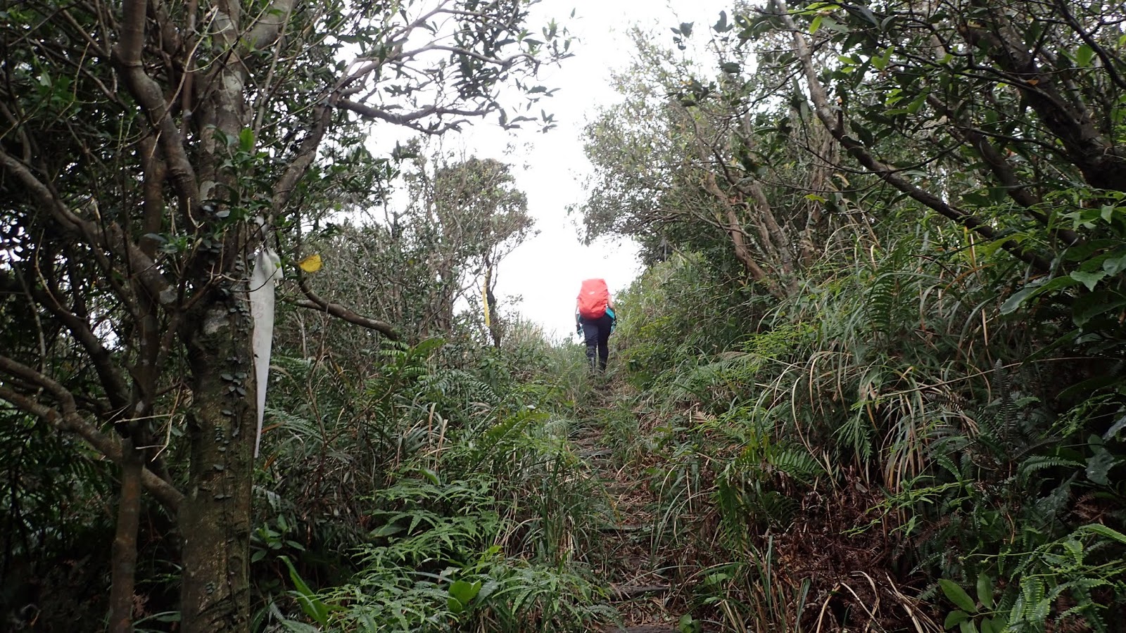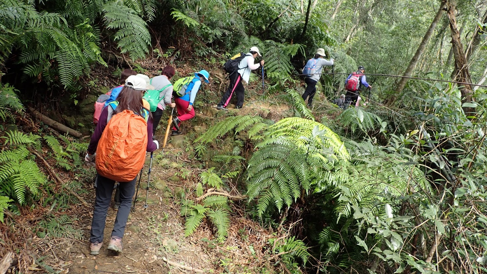 沿著稜線走, 岩壁陡峭, 路面微濕