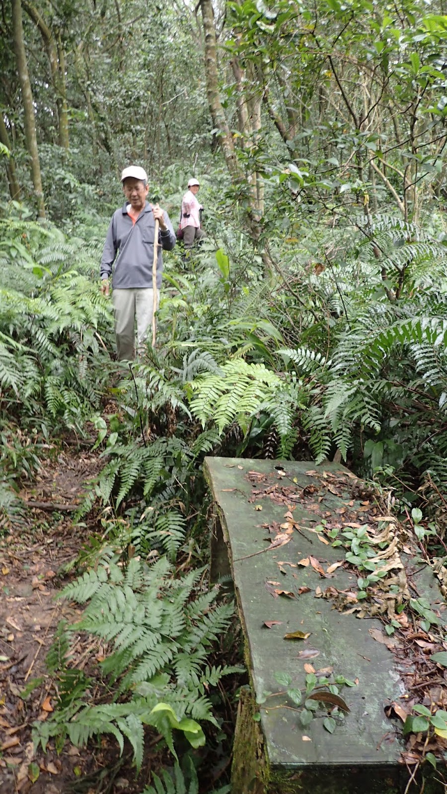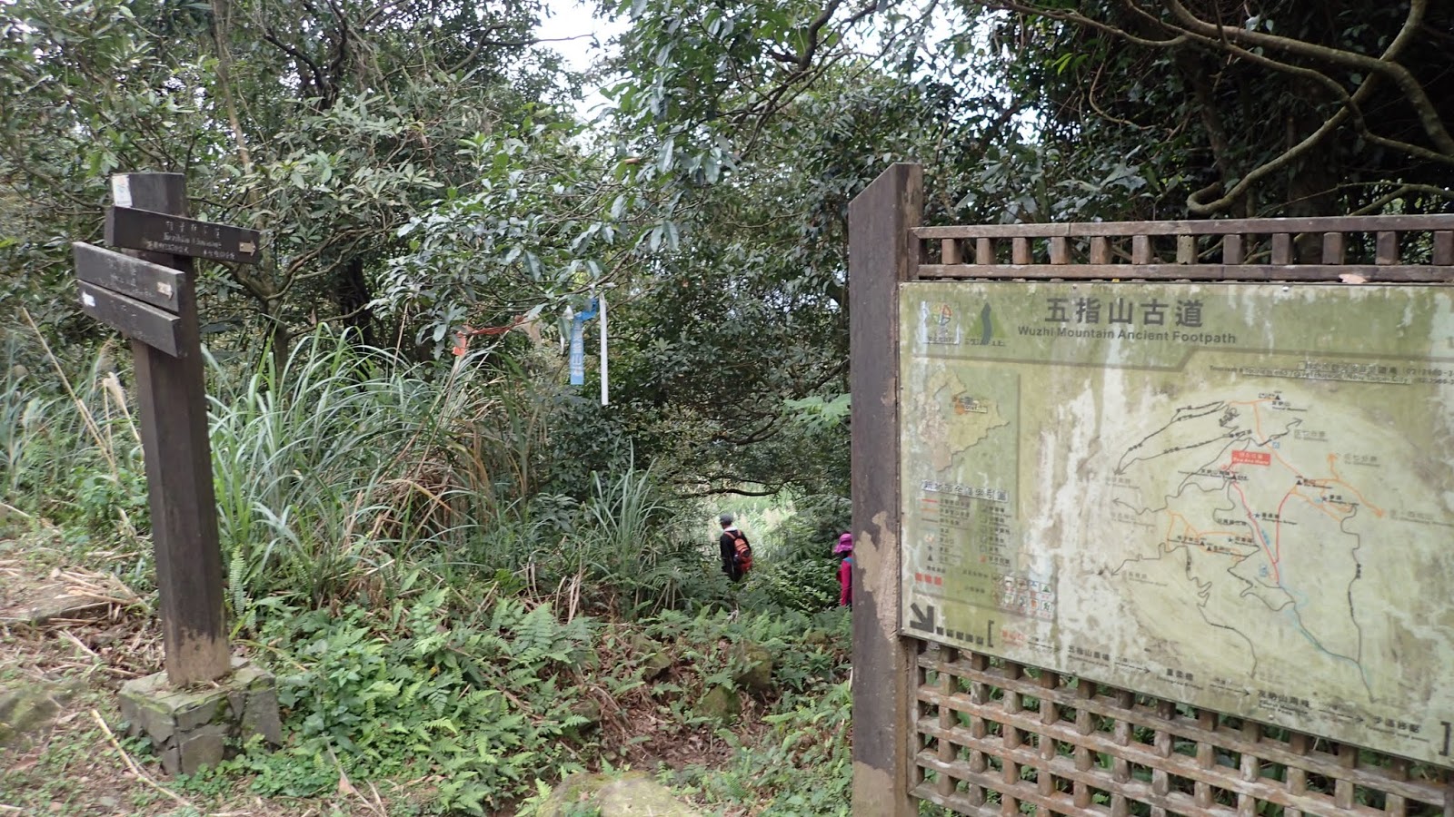 依著領隊畫的粉筆箭頭又見五指山古道入口, 繼續往下走