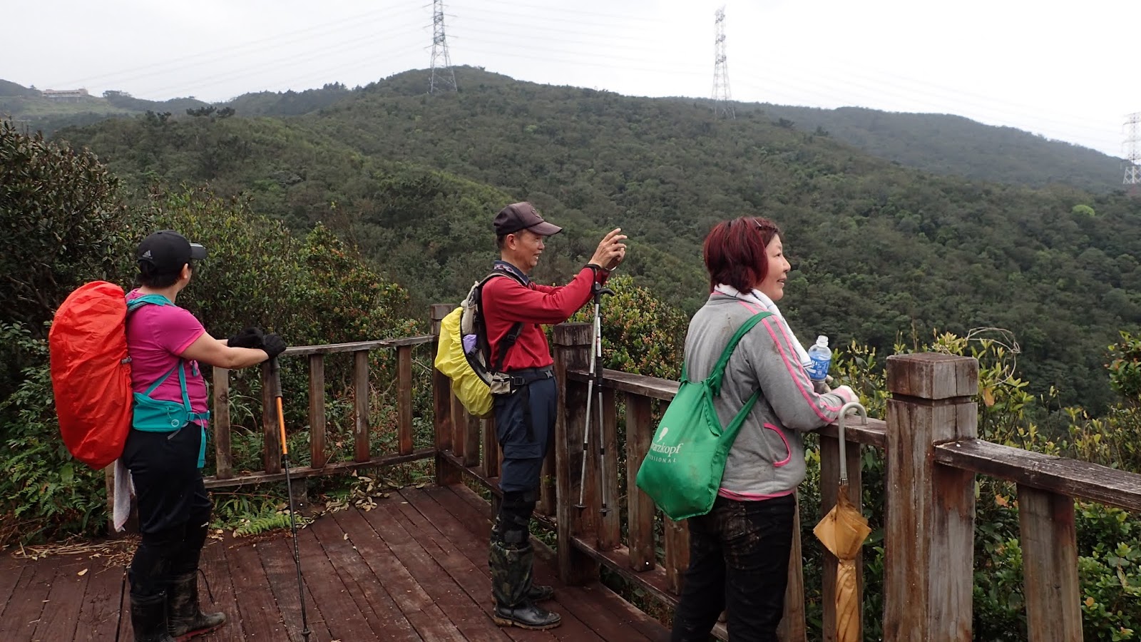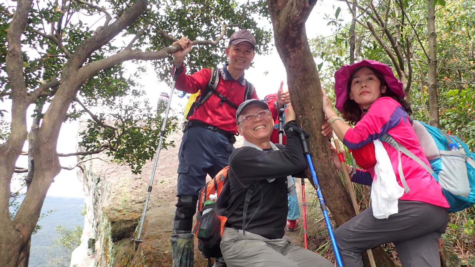 上新山岩壁頂端, 大家忙著拍照, 休息吃中餐, 後面是汐萬路彩虹橋