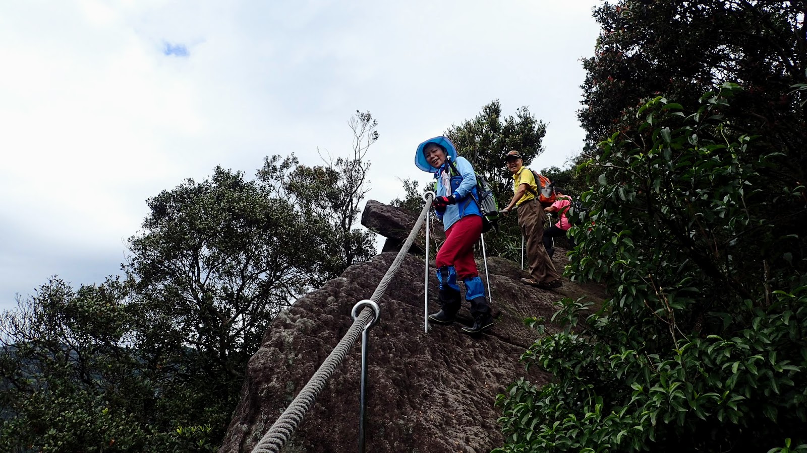 一旁架有護欄繩索, 踩穩岩壁小心攀爬