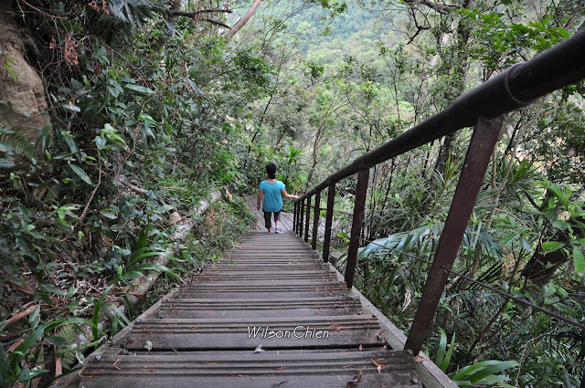 此處步道較人工化了 石階梯, 木棧道&碎石交錯的步道, 大樹林蔭鳥兒與松鼠穿梭期間,