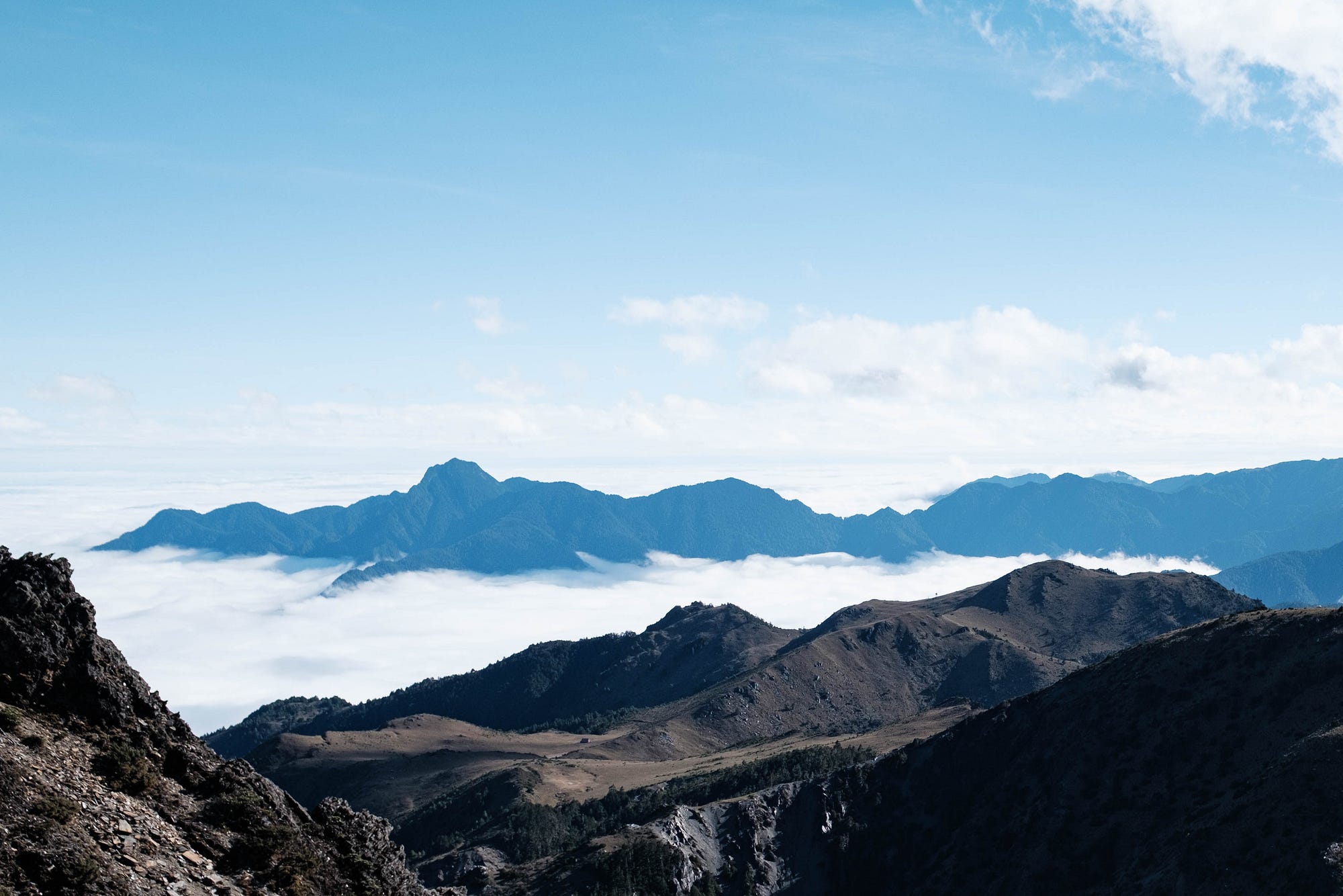 右邊圓圓的山頭就是大水窟山,視線往左延伸就是大水窟草原與大水窟山屋,美麗排行榜貌似第一的大水窟山屋一直很想去,希望今年南二段可以成行啊,想去拍拍大水窟山屋。這次只能遙遠的看著大水窟草原與小小的大水窟山屋囉。