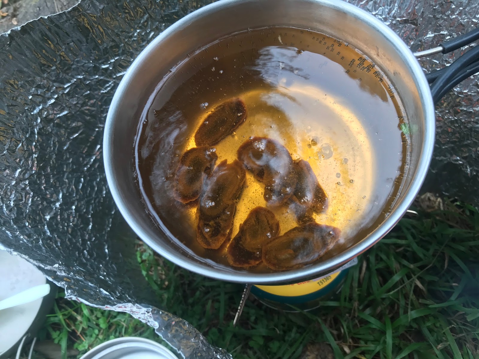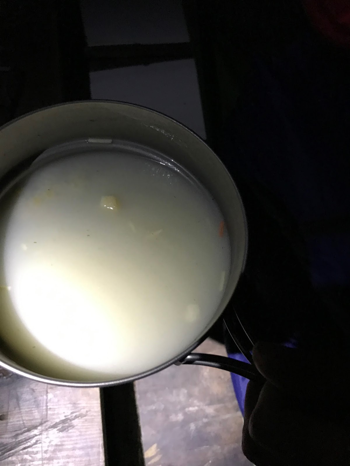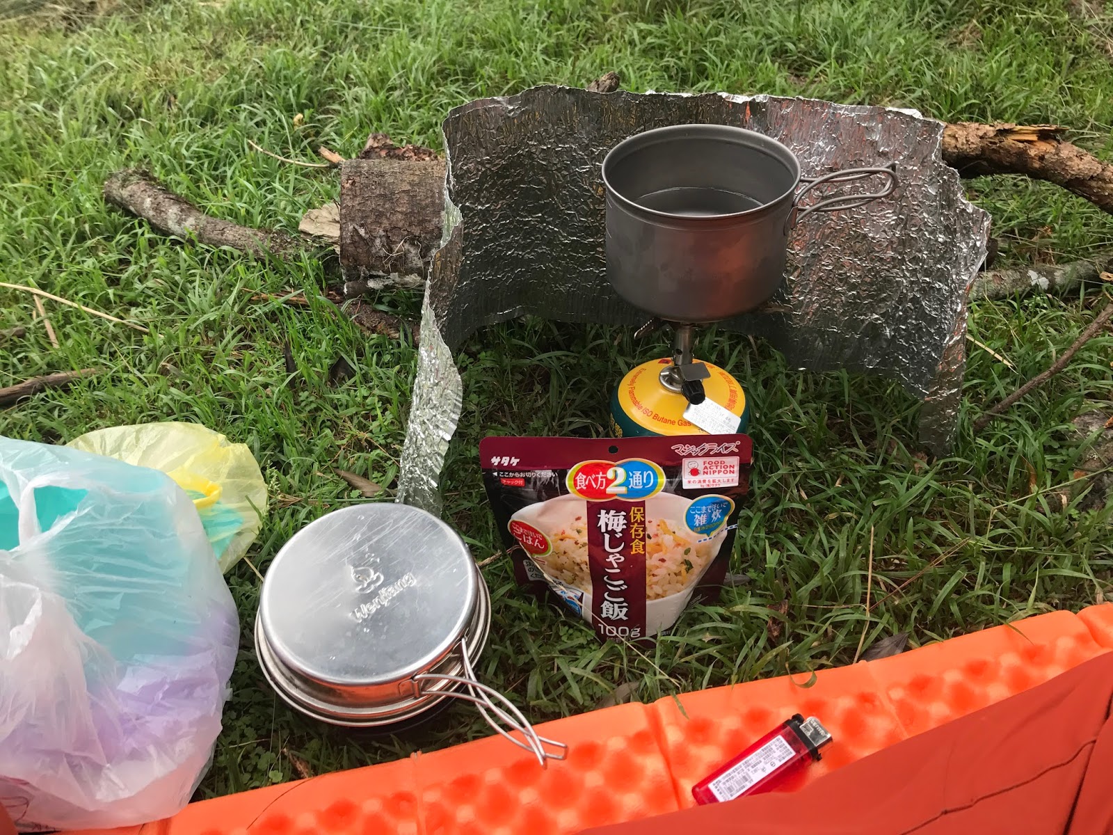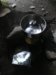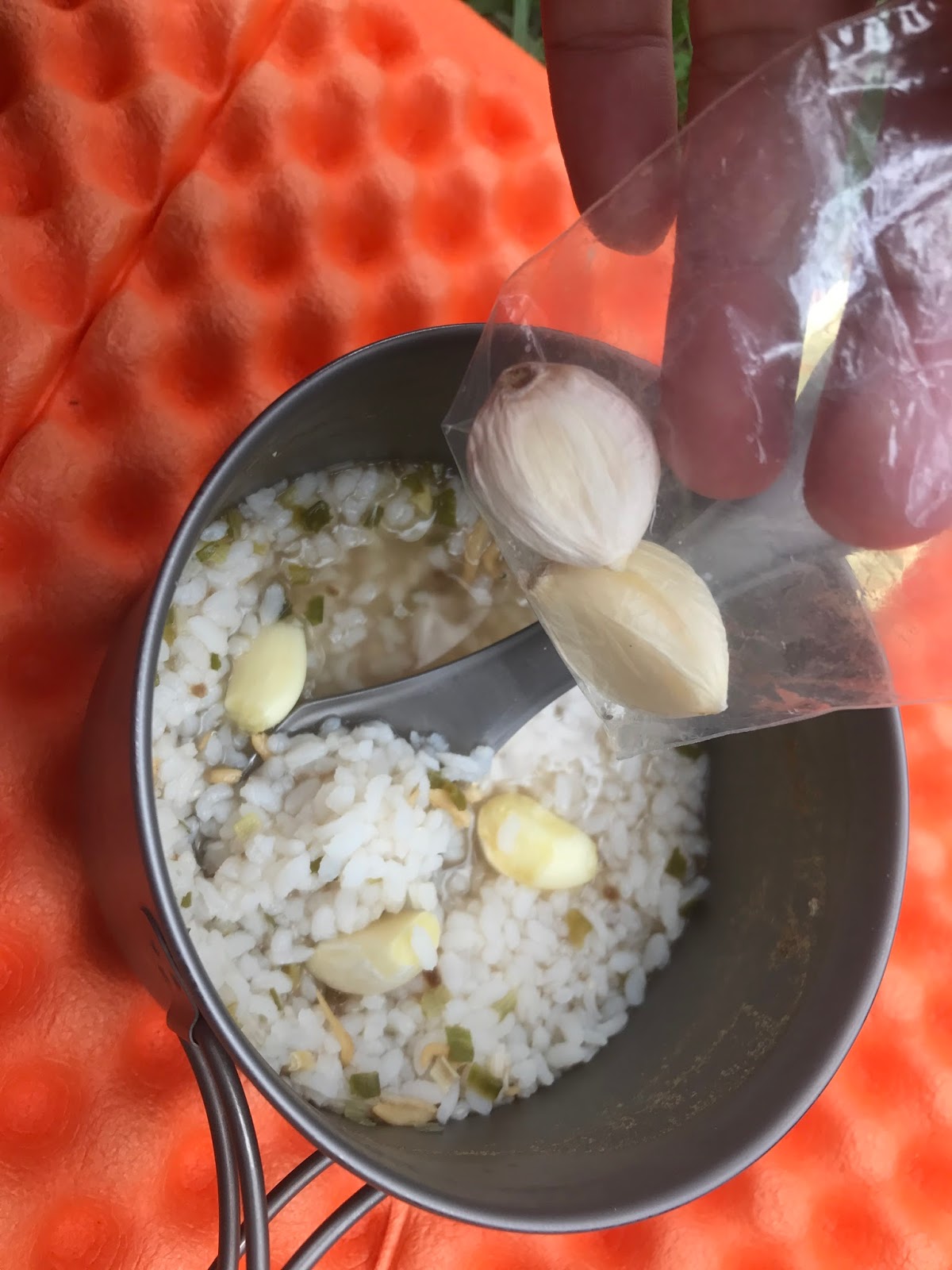 馬上拿出睡墊出來坐,順便燒點熱水泡個乾燥飯充飢一下!終於想到帶了六天的蒜頭終於可以拿出來吃了!其實是一直忘記懶得拿