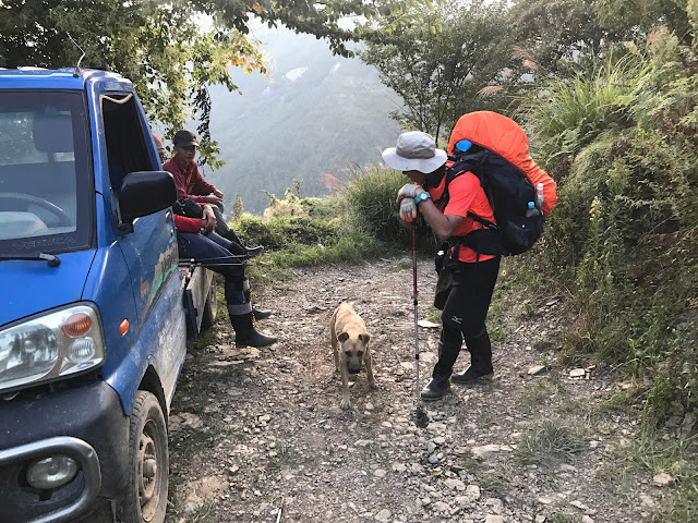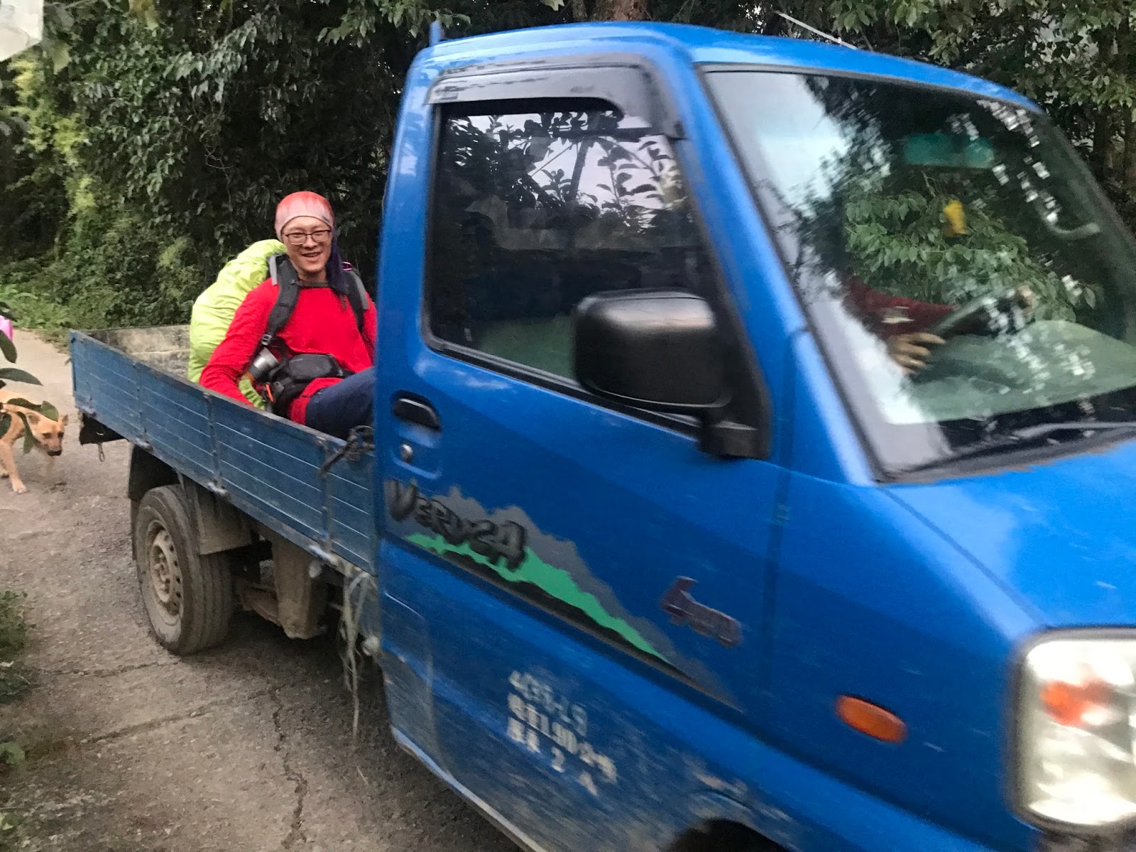 好心大哥開著貨車也準備下山,問了我們一下!要不要搭順風車,領隊超開心,馬上跳上去!我則幫他背單眼,也是蠻重的。不過都剩200公尺,我要靠雙腳走完這趟未完的北一段。跳上車那瞬間,領隊你就沒完成了啊!!哈哈哈