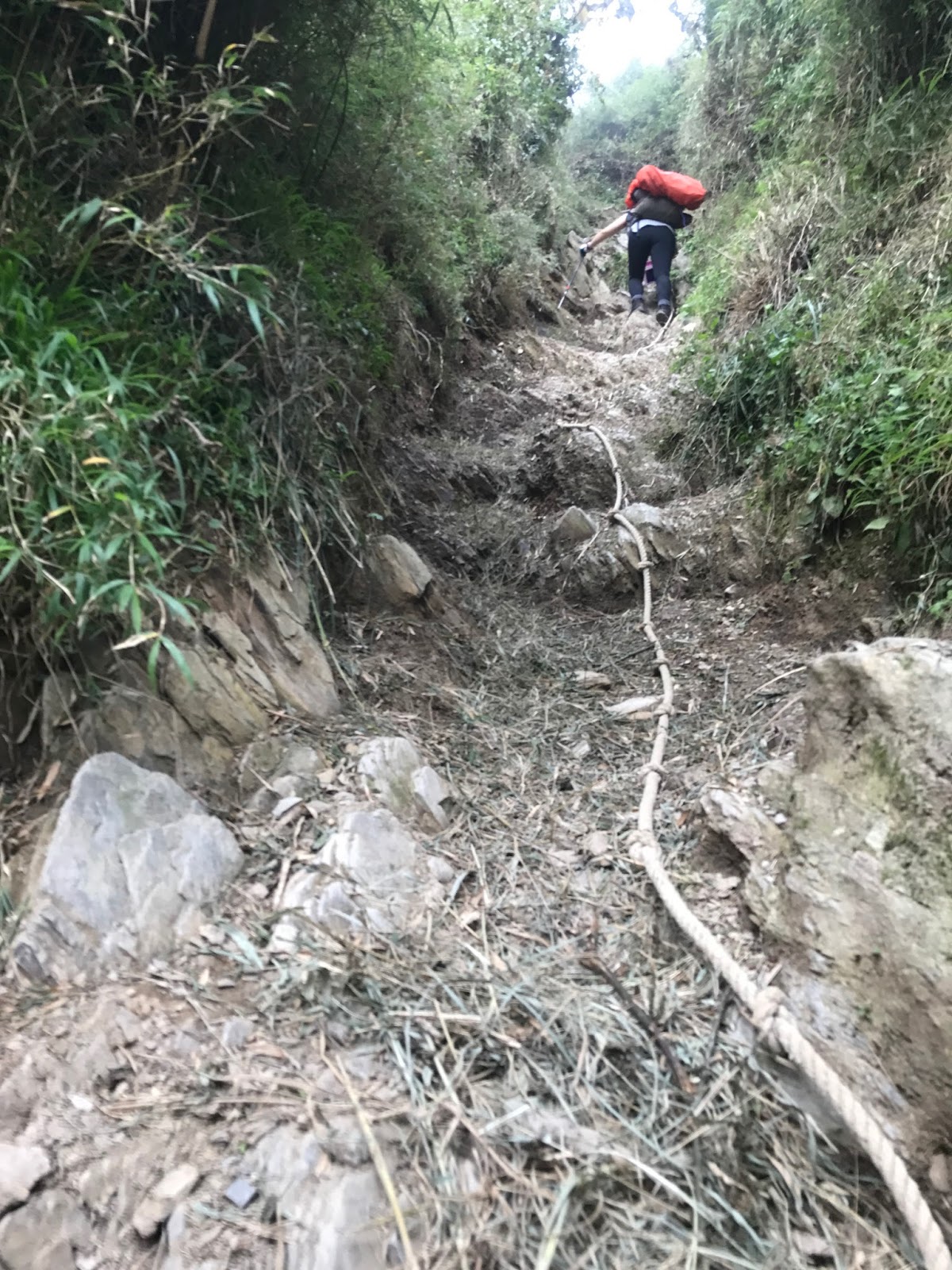 岩盔:全路段碎石、岩石、樹根、箭竹林很多!!手腳撞傷都還可行動!但頭部受傷基本就是原地等待救援了!為了降低風險,帶習慣成自然!!這次有跌到中央尖溪幸好沒撞到。