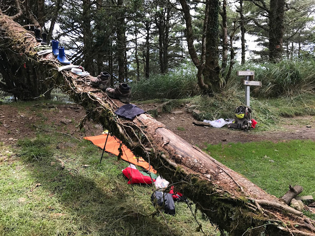 我則趁這時候,將朔溪鞋跟登山鞋,凡是濕濕的都拿出來晾一下,雖然太陽時有時無,還起濃霧!不過總比悶在塑膠袋中好。