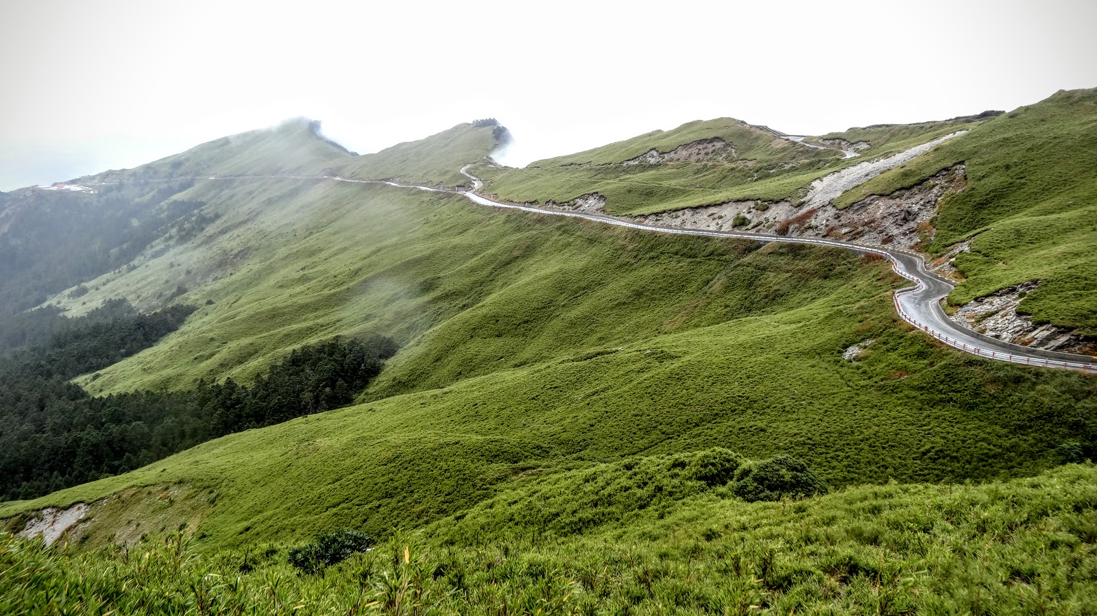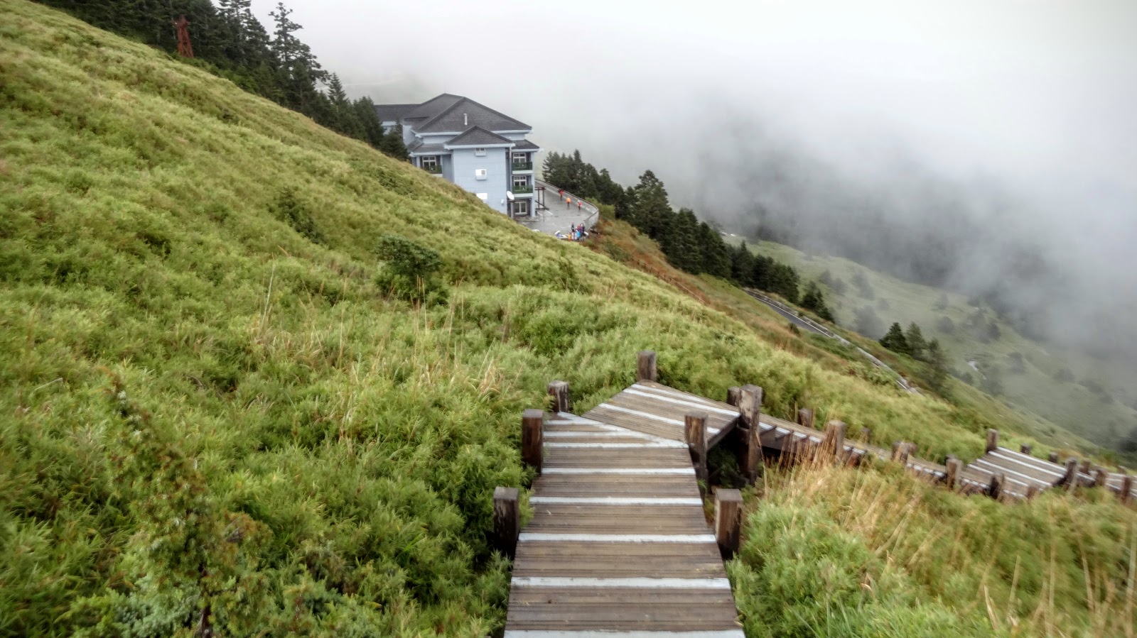 一眼望去無際的青青草原伴著山巒與霧霾有說不出的美麗與清新, 順著木造階梯往上走, 木造階梯雖濕不滑, 但強風一陣一陣颳著深怕被吹走, 雙腿微微發抖越走越慢越無膽, 眼前的階梯看似無止境