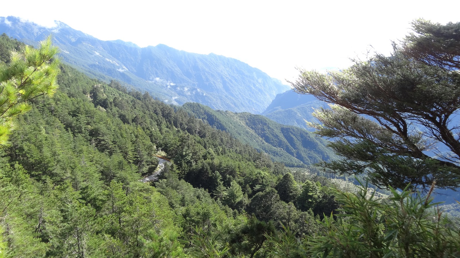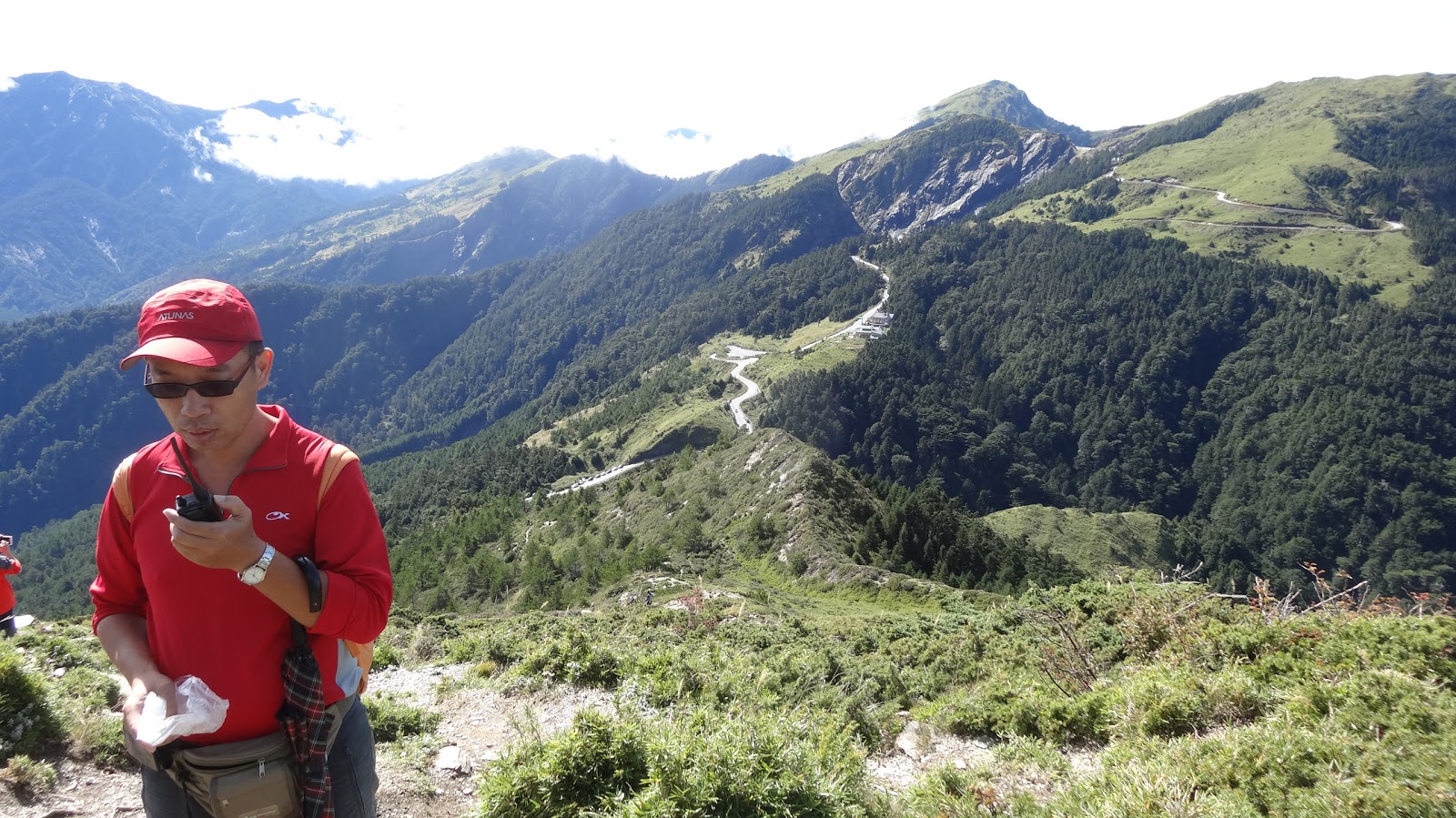 繼續挑戰說是最容易走的百岳石門山, 右後方高聳的山是預定明天要爬的合歡尖山, 看那陡峭的階梯實在不是我的菜, 不管了, 先把石門山撿了再說, 順著公路旁的稜線走