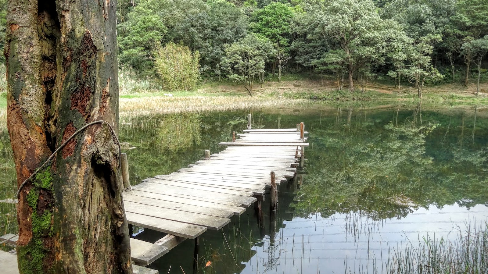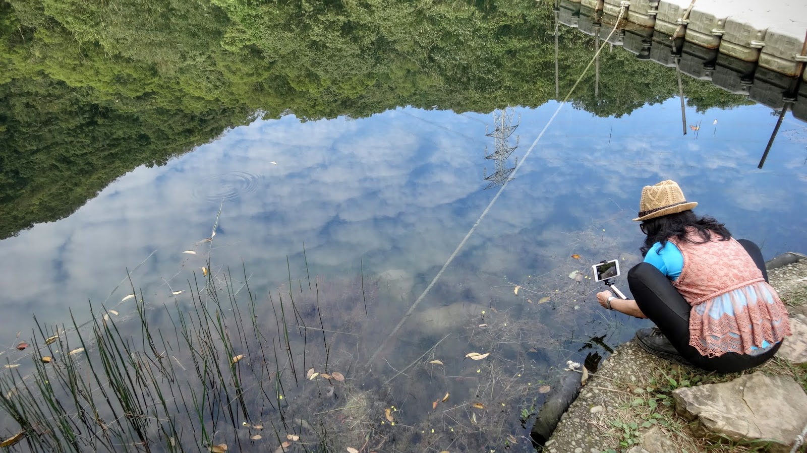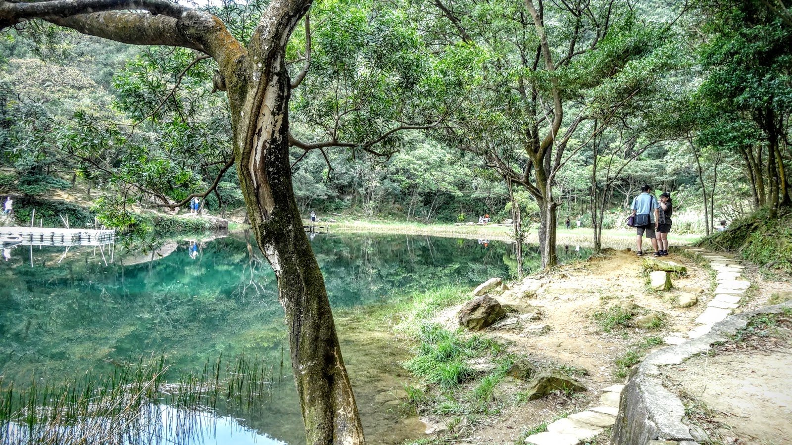 丟下背包顧不得用餐繞行一圈, 眼前如此這般的美麗景致實在太讓人感動了, 群山環繞著碧綠的湖泊, 一旁的老樹, 碧藍的天空及層層山巒倒映在湖面上, 清澈見底的水邊有彩色的水生植物及成群不怕人的小魚, 形成這般夢幻奇景, 是無法言喻的美麗