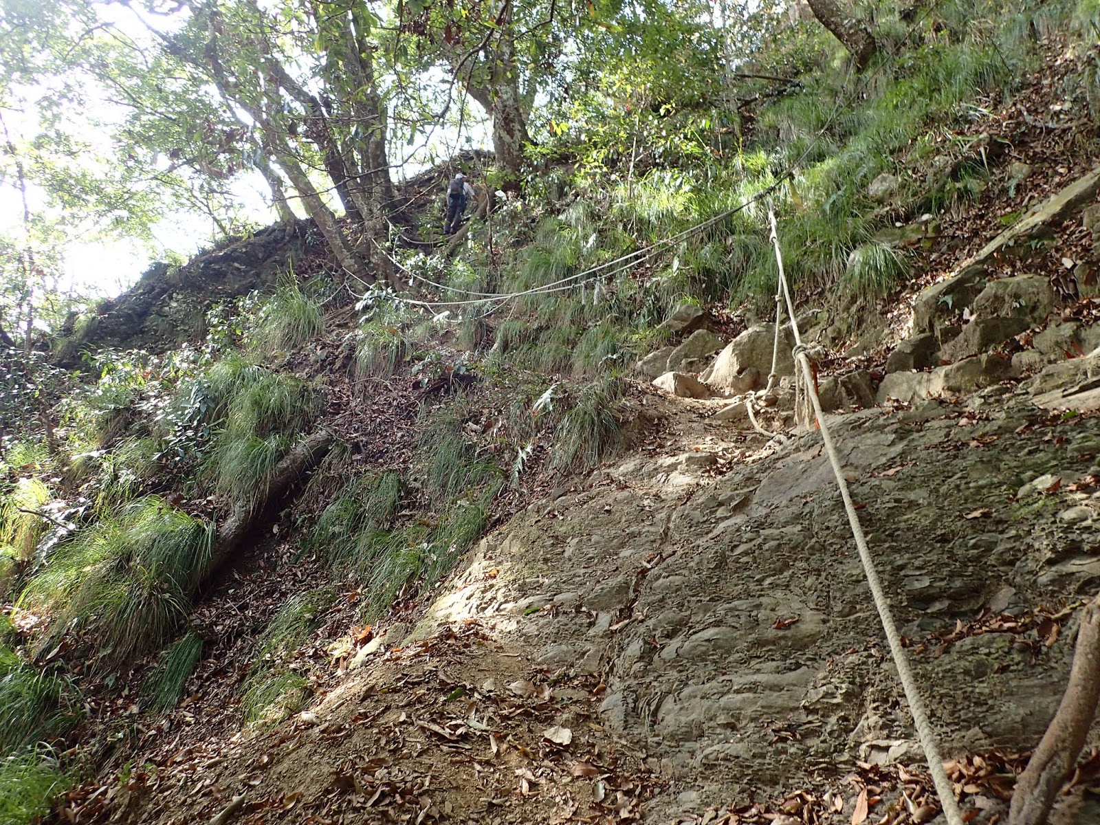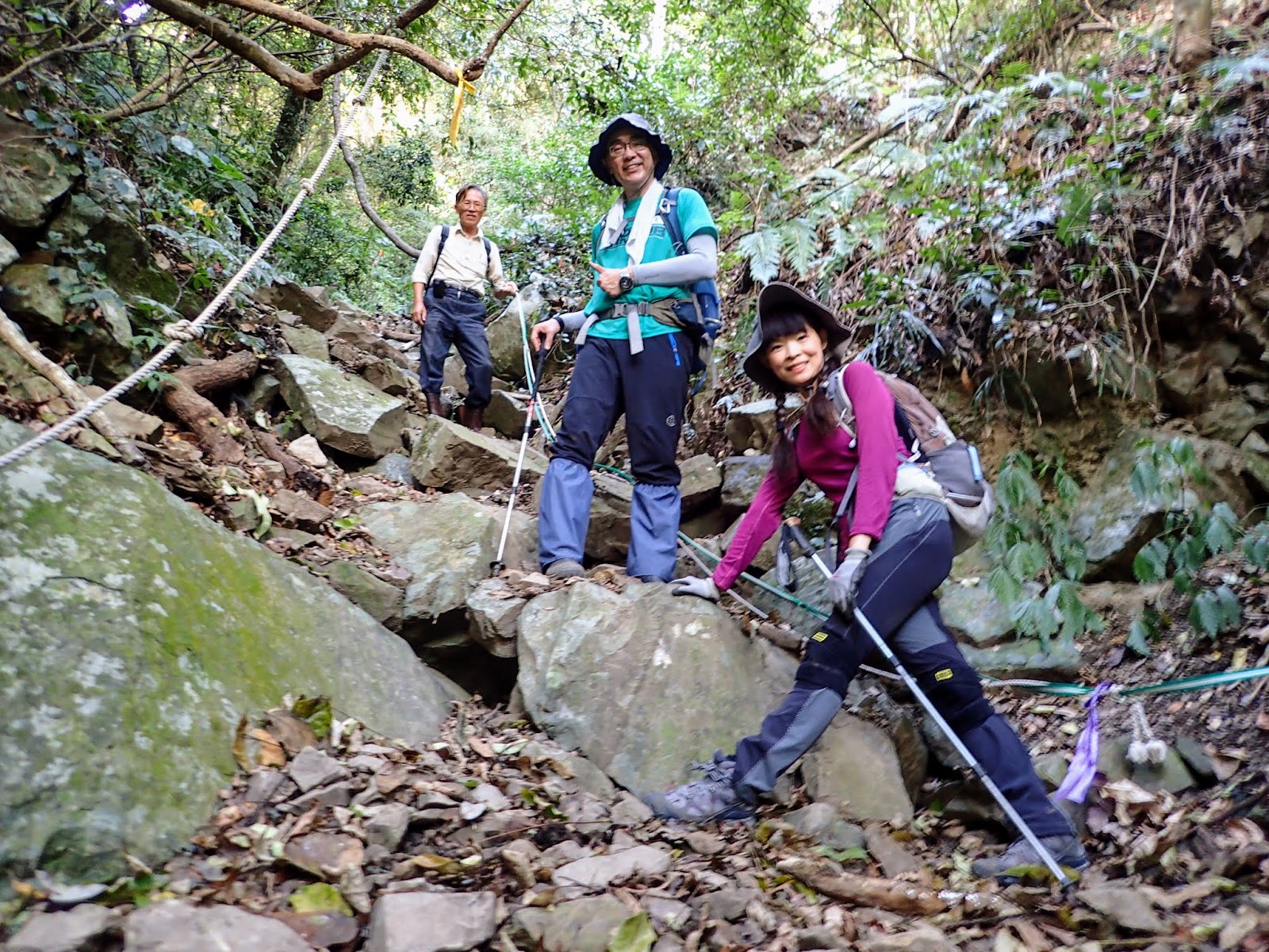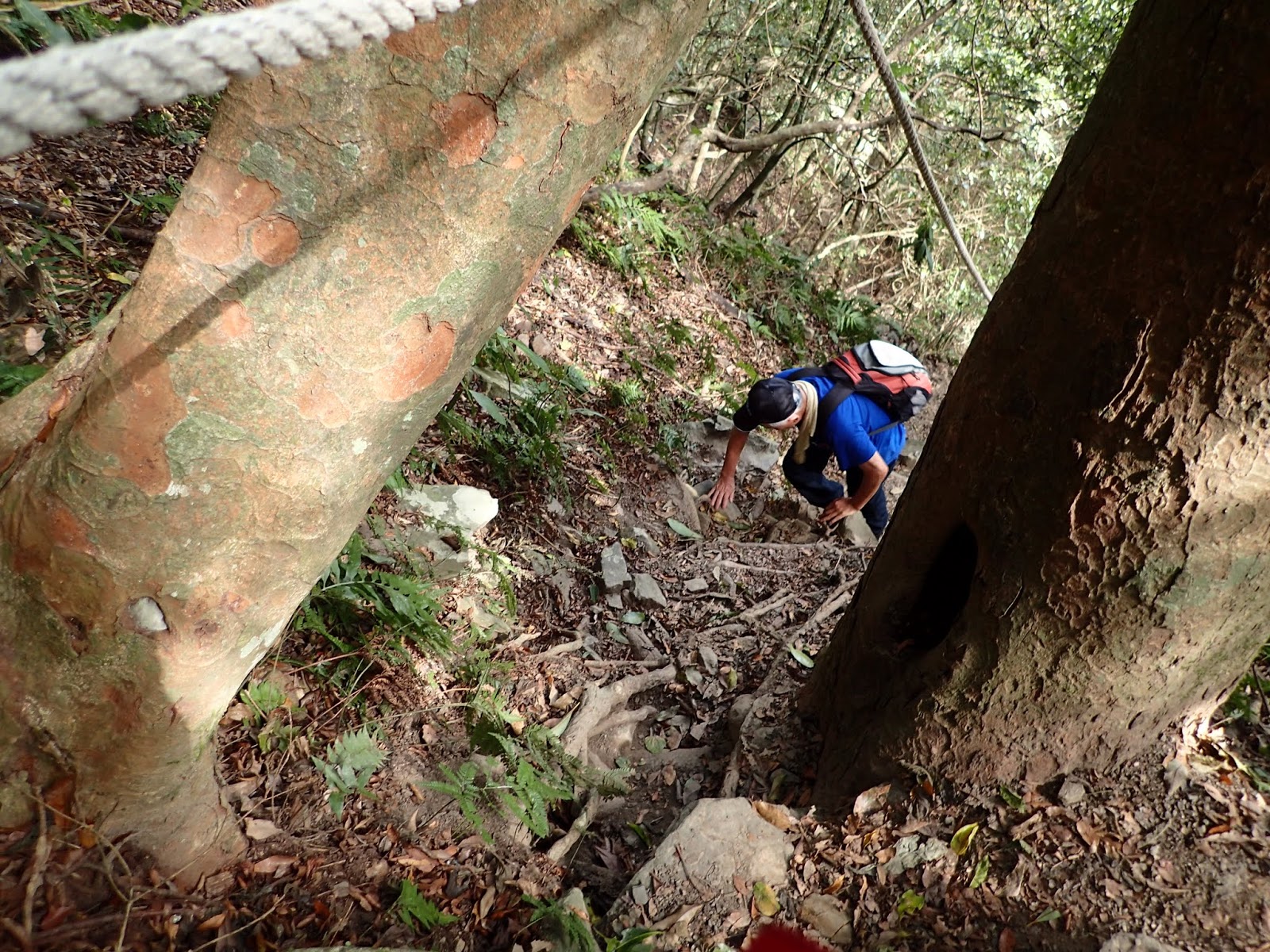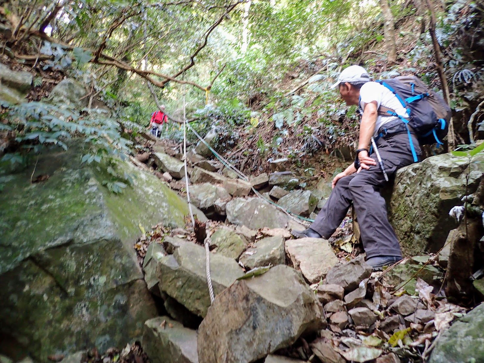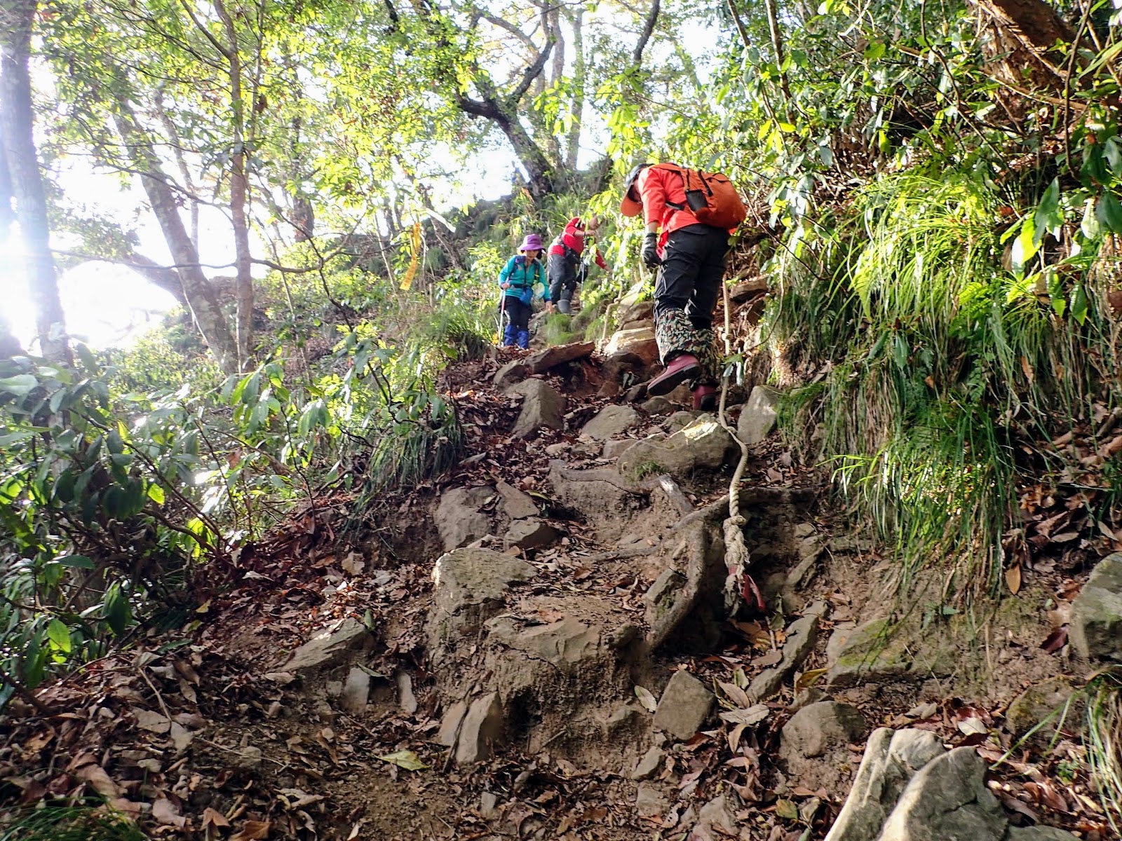 後面的路十分陡峭還是碎石路, 一路上幾乎都有拉繩輔助, 開始好戲上場