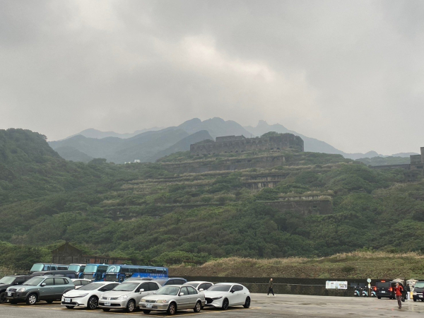 從水湳洞停車場旁的觀景平台望向陰陽海,風浪很大,寒風刺骨讓人感覺非常冰冷,手機定位溫度顯示體感只有9度,早上出門到現在的我們只想趕緊去金瓜石(黃金博物館)附近商店找東西吃。