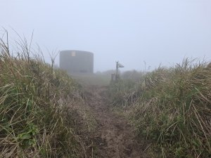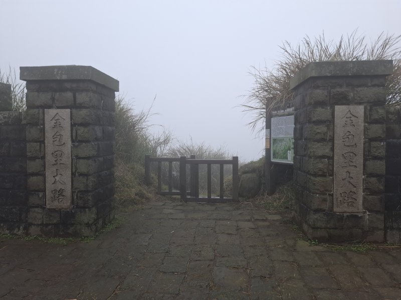下山循擎天崗環狀步道繞經金包里大路城門,時已霧茫茫一片,並飄起細雨。
