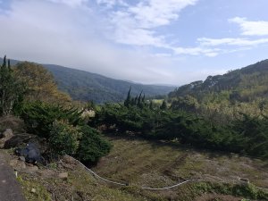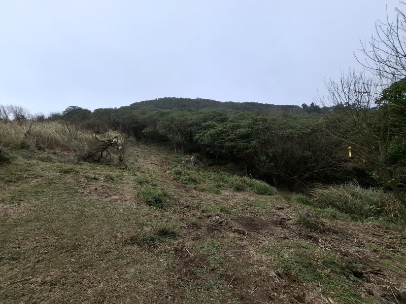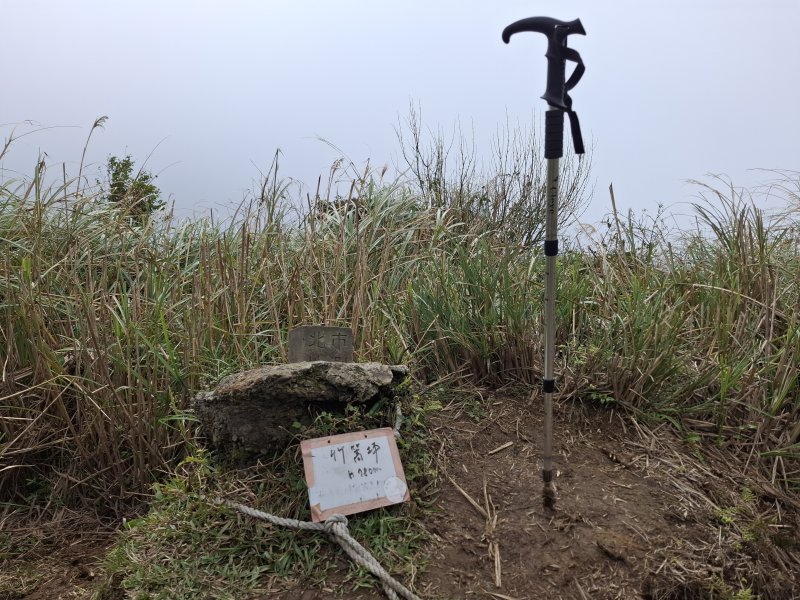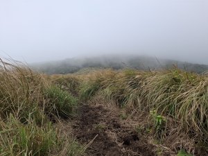 山頭雲霧瀰漫,穿越荒涼的芒草區,山徑坑坑疤疤似牛隻踩踏過,偶見牛糞幾許