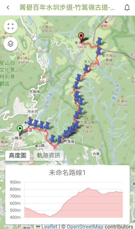 登山路線軌跡: 劍潭站搭小15於《菁山二》下車→約300m農路→菁礐百年水圳步道→菁山路131巷→竹篙嶺古道→松石草原→竹篙坪→竹篙山/4號圓堡→竹篙山步道→3號圓堡→擎天崗大草原/環狀步道→1號圓堡→金包里大路城門→遊客中心