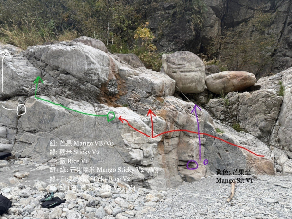 三條路線可以兩兩搭配出芒果糯米、糯米飯,跟最終版本「芒果糯米飯」。難關在糯米的最後一動,爬到飯的開頭時可以坐著休息,跟美國 Joshua Tree 國家公園的經典路線 Gunsmoke 有點異曲同工之妙!