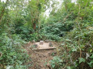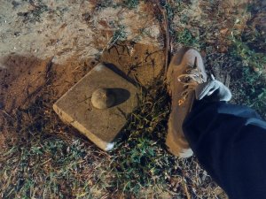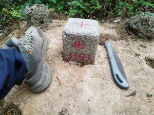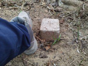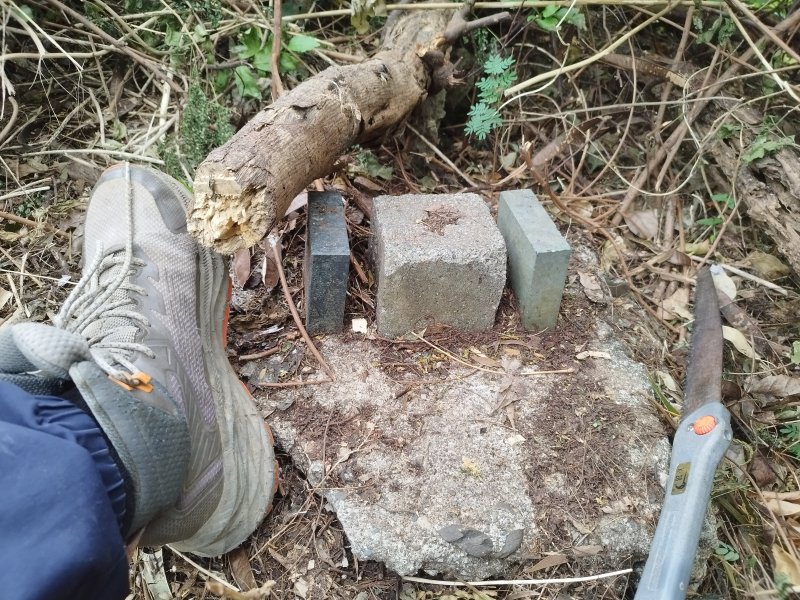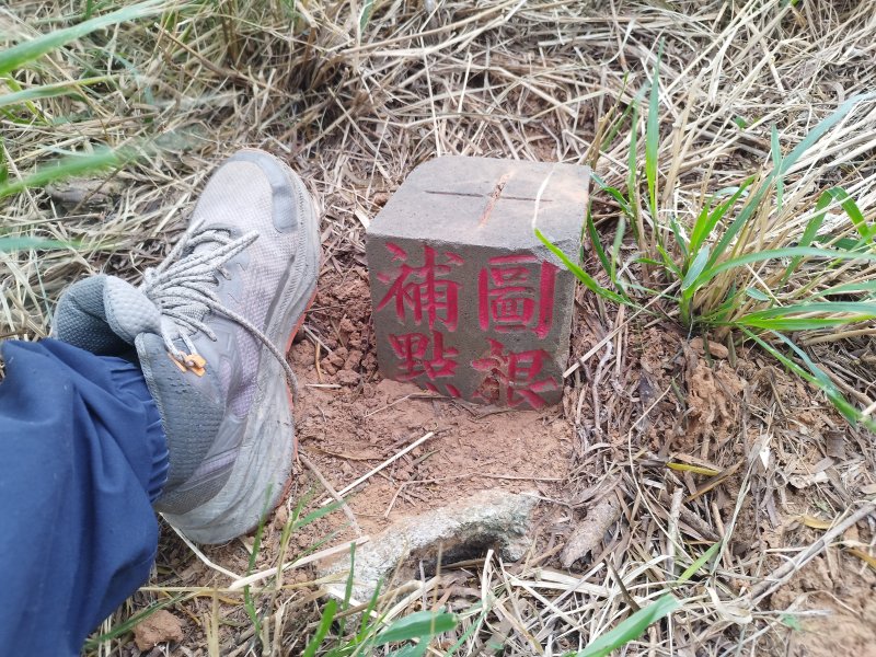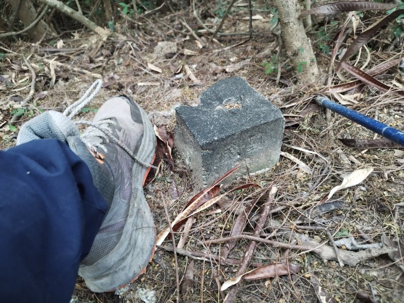 太平頂兩基石~16(回到剛剛的岔路續往山頂走,路左草叢中有一顆水泥材質的基石)