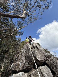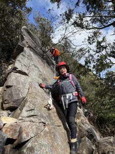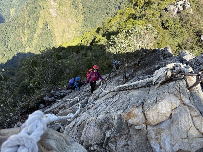 ◎垂直岩壁 完全仰仗拉繩 幾處釘有鋼筋踏點 緩解驚險